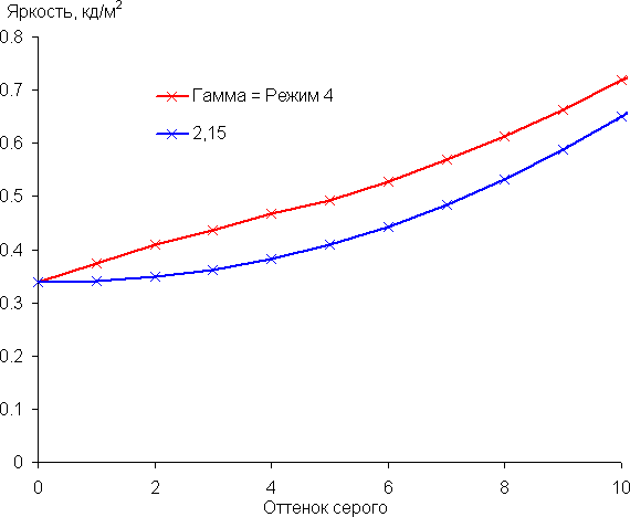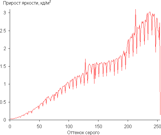 Реальная гамма-кривая ближе всего к стандартной при выборе Режим 4, поэтому далее мы измерили яркость 256 оттенков серого (от 0, 0, 0 до 255, 255, 255) при этом значении. Дополнительно настройку Контрастность мы уменьшили до 65 (по умолчанию 70), но завал в светах на один оттенок избежать все равно не получилось. График ниже показывает прирост (не абсолютное значение!) яркости между соседними полутонами: