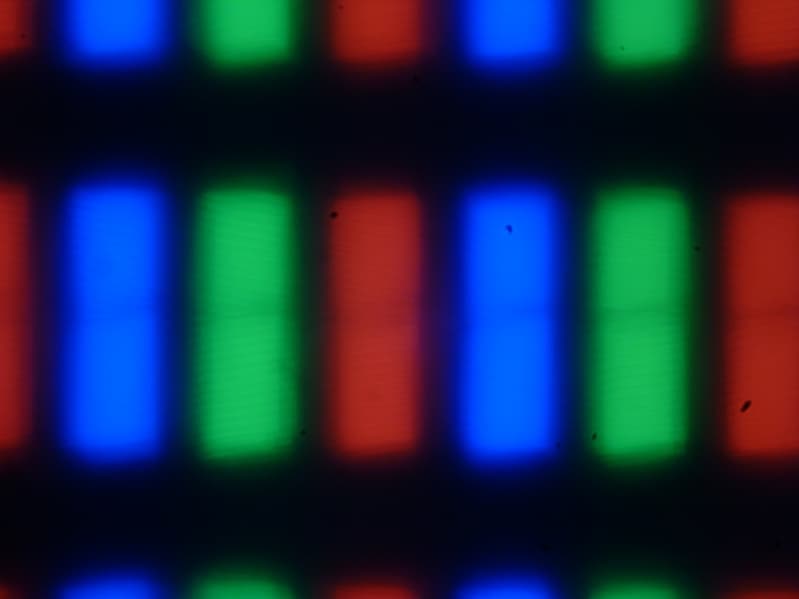 Из-за матовой поверхности экрана четкого изображения пикселей получить не удалось (черные точки — это пыль на матрице фотоаппарата), однако характерная для IPS структура субпикселей просматривается: