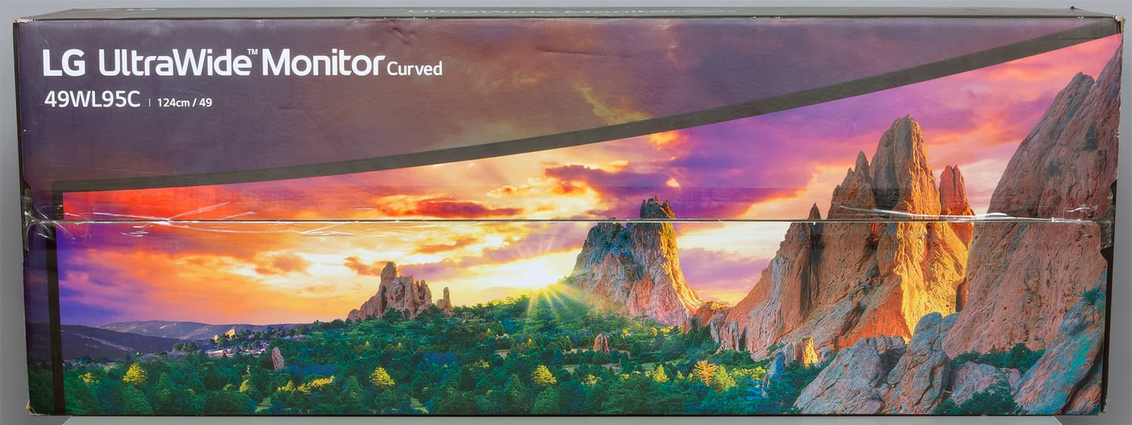 Монитор нам достался упакованным в большую вытянутую красочно оформленную коробку из гофрированного картона. Внутри коробки для распределения и защиты содержимого используются пенопластовые вставки. Переносить упакованный в коробку монитор придется вдвоем, ухватившись за прорезные ручки на коротких гранях.