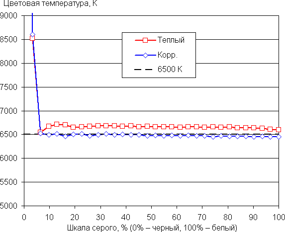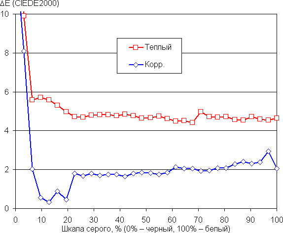 Цветопередача при выборе, например, профиля Пользовательский и варианта Теплый для цветовой температуры удовлетворит не очень требовательного пользователя. Мы попытались вручную скорректировать цветовой баланс, регулируя усиление трех основных цветов. Графики ниже показывают цветовую температуру на различных участках шкалы серого и отклонение от спектра абсолютно черного тела (параметр ΔE) без вмешательства (Теплый) и после ручной коррекции (Корр.):