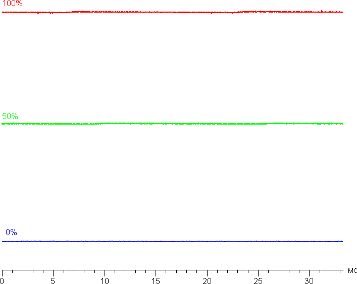 Яркость монитора меняется именно яркостью подсветки, то есть без ущерба для качества изображения (сохраняется контрастность и количество различимых градаций) яркость монитора можно менять в достаточно широких пределах, что позволяет с комфортом работать и смотреть фильмы как в освещенном, так и в темном помещении. На любом уровне яркости мало-мальски значимая модуляция подсветки отсутствует, что исключает видимое мерцание экрана. В доказательство приведем графики зависимости яркости (вертикальная ось) от времени (горизонтальная ось) при различных значениях настройки яркости: