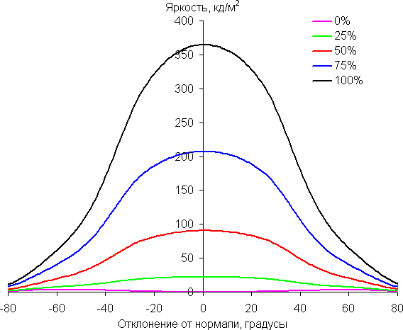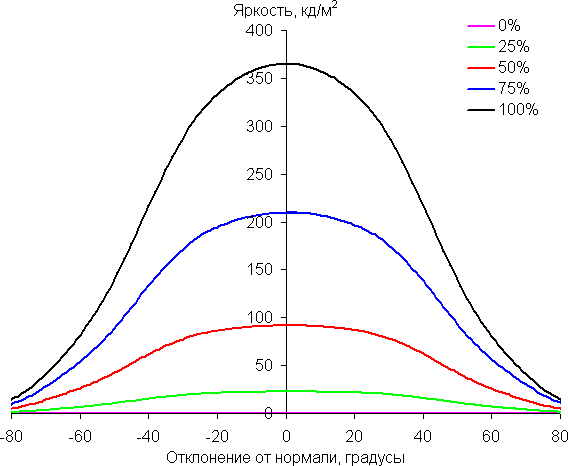 Чтобы выяснить, как меняется яркость экрана при отклонении от перпендикуляра к экрану, мы провели серию измерений яркости черного, белого и оттенков серого в центре экрана в широком диапазоне углов, отклоняя ось датчика в вертикальном, горизонтальном и диагональном (из угла в угол для формата 16:9) направлениях.