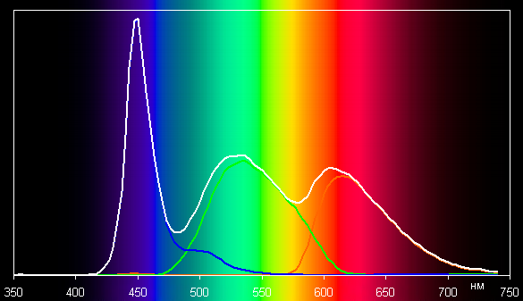 Такой спектр с относительно узким пиком синего и с широкими горбами зеленого и красного цветов характерен для мониторов, в которых используется светодиодная подсветка с синим излучателем и желтым люминофором.