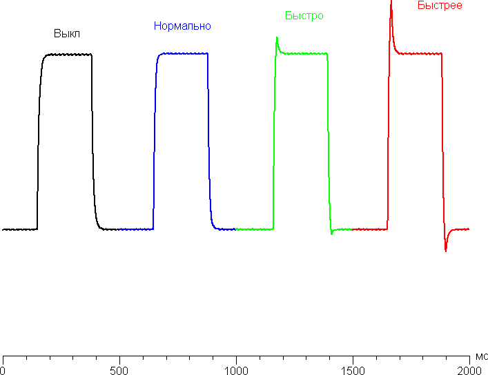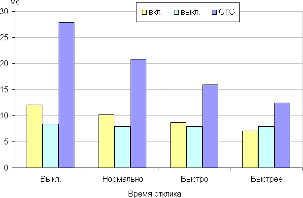 Время отклика зависит от значения одноименной настройки, которая управляет разгоном матрицы. Ступени регулировки четыре. График ниже показывает, как меняется время включения и выключения при переходе черный-белый-черный (столбики «вкл.» и «выкл.»), а также среднее суммарное время для переходов между полутонами (столбики GTG):