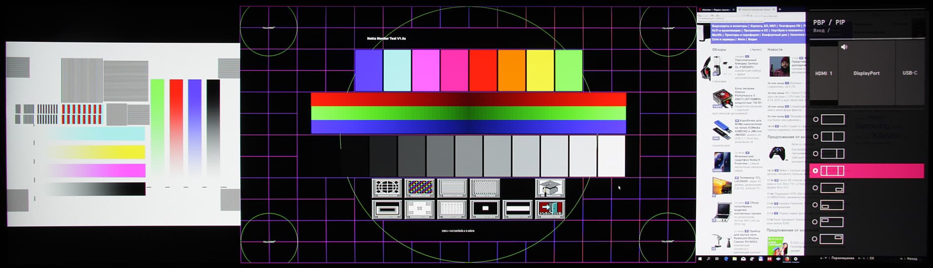 В режиме PBP при разделении экрана на две части по горизонтали можно получить два изображения 2560×1440 или одно 3440×1440 плюс еще одно 1680×1440 с выводом точка в точку и с заполнением всей области отображения от двух независимых источников. При разделении на три части — два изображения 1280×1440 по краям и одно 2560×1440 в центре. Поддерживается вывод с сохранением исходного соотношения сторон или с заполнением областей вывода. Пример вывода изображений от трех источников: