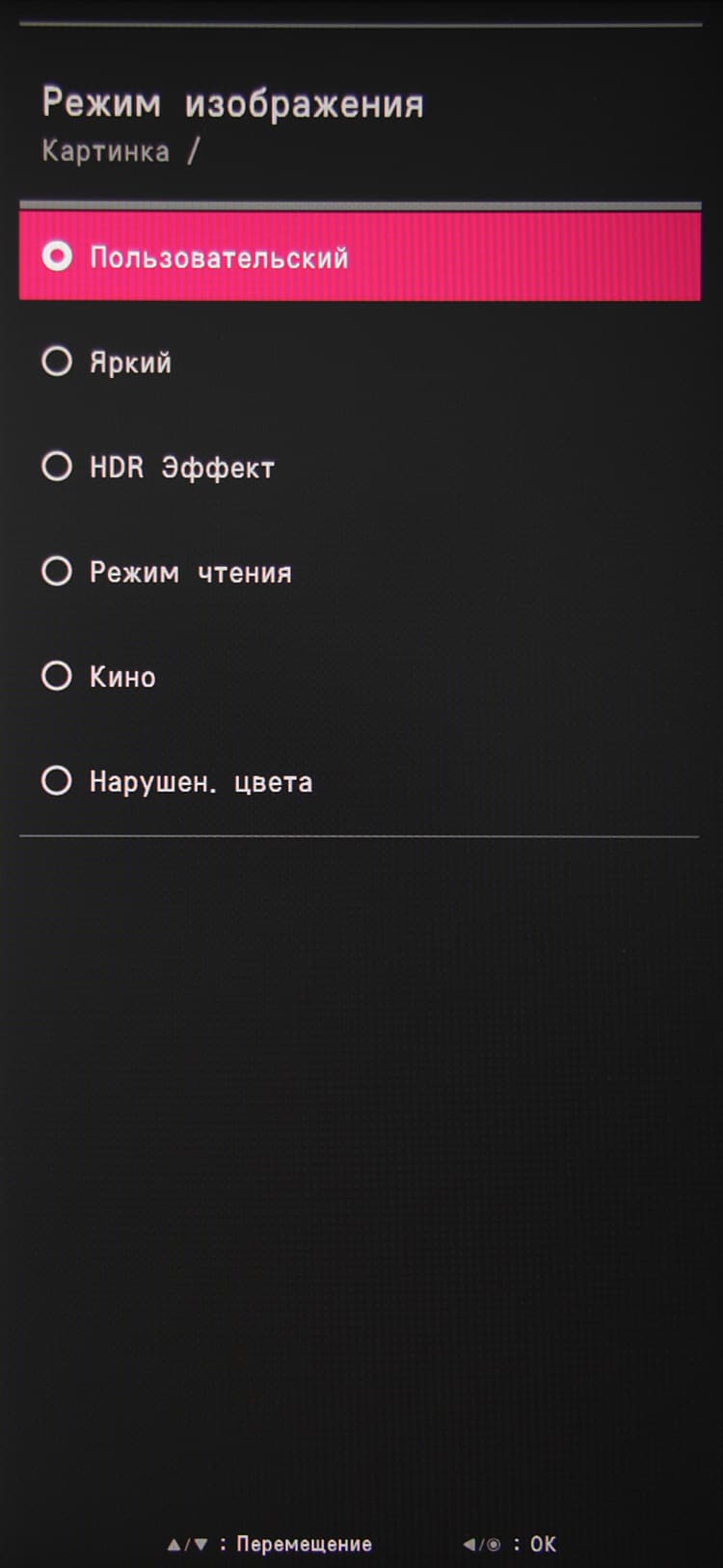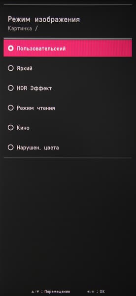 Есть несколько предустановленных профилей (список Режим изображения) с заданными значениями настроек изображения и пользовательский, в котором доступно большинство настроек.