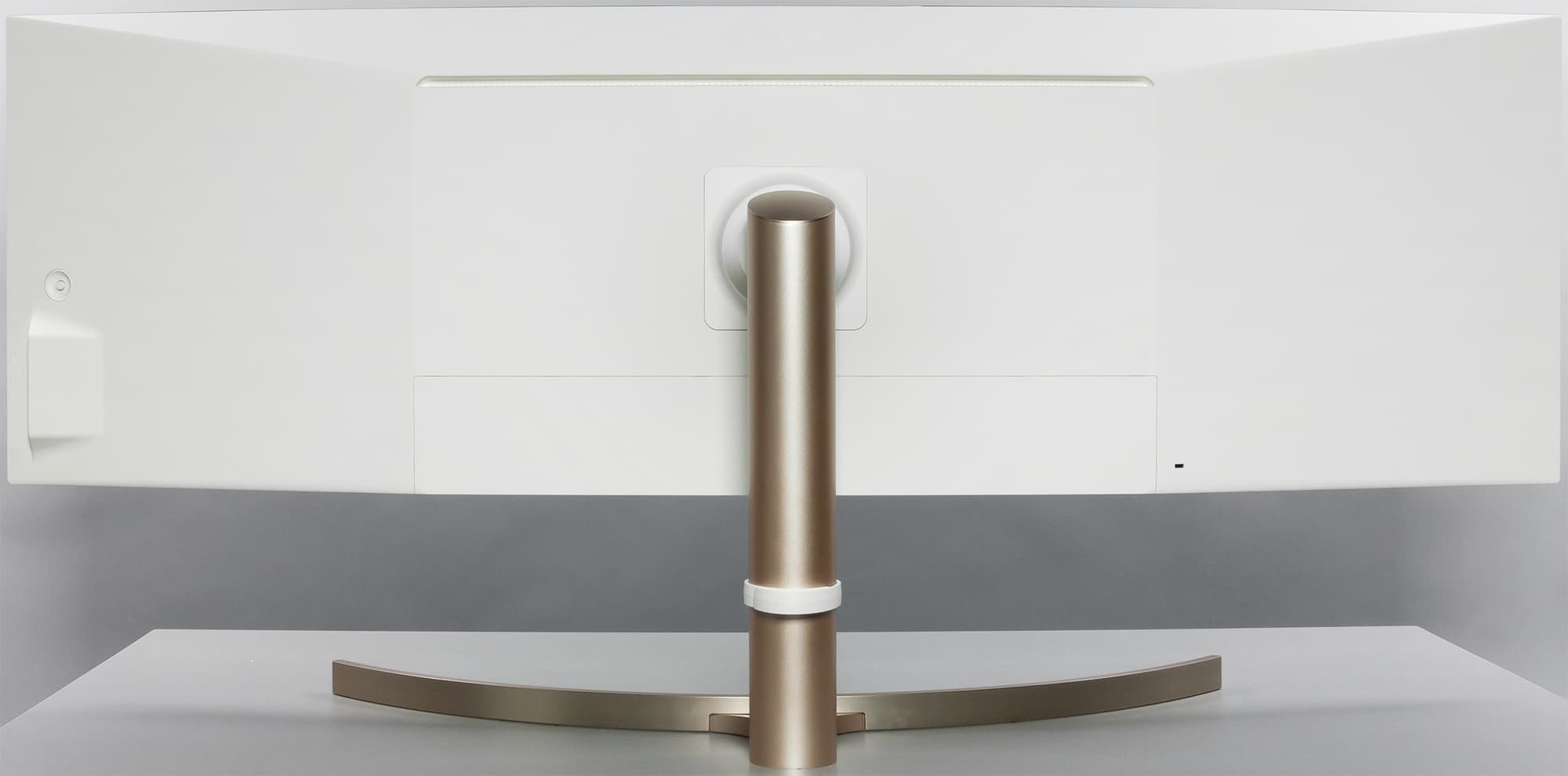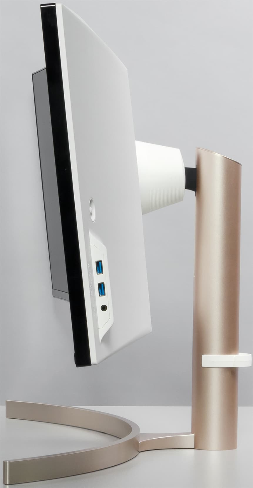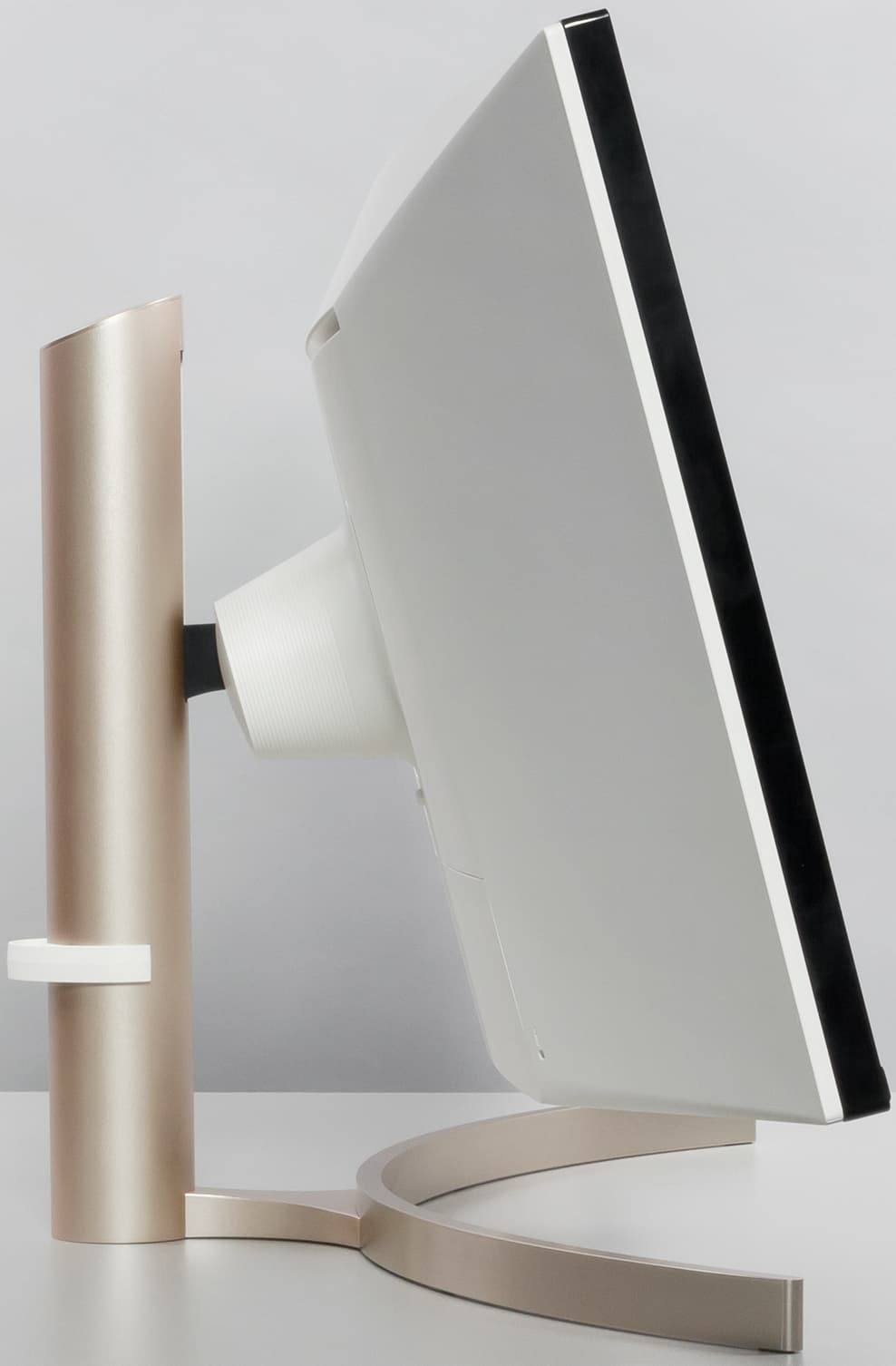 Стойка имеет фиксированную высоту. Шарнир с крепежной площадкой перемещается по алюминиевым хорошо смазанным направляющим, а в качестве подшипника используются вставки из пластика с малым коэффициентом трения. При этом пружинный механизм компенсирует вес блока экрана. Изготовленные из алюминиевого сплава монолитная дуга-опора, цилиндрическая часть стойки и соединяющий их элемент снаружи анодированы и покрашены в цвет, который производитель называет золотистым. Подставка на блок экрана крепится на защелках одним движением, а отсоединяется также просто, при удерживании кнопки фиксатора. Подставку можно отсоединить (или не подсоединять изначально) и закрепить блок экрана на VESA-совместимом кронштейне с отверстиями по углам квадрата со стороной 100 мм.