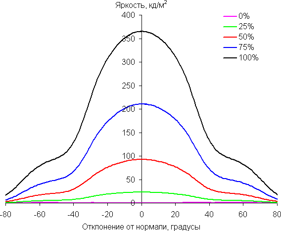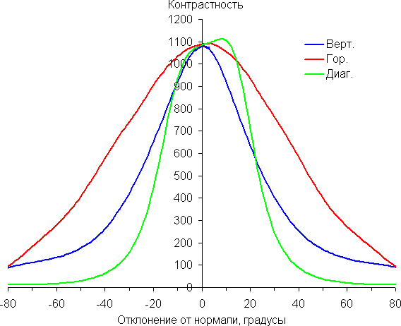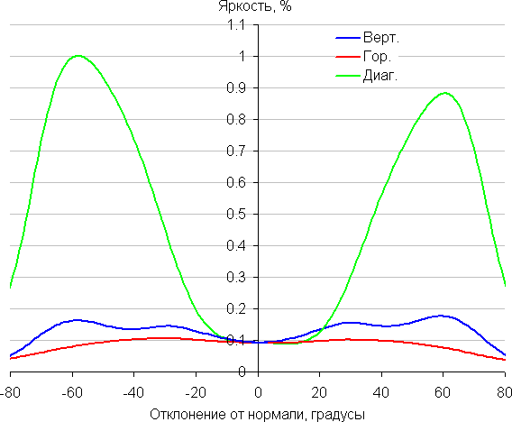 Отметим плавное уменьшение яркости при отклонении от перпендикуляра к экрану в горизонтальном направлении, при этом графики не пересекаются во всем диапазоне измеряемых углов. Чуть быстрее падает яркость при отклонении в вертикальном направлении. При отклонении в диагональном направлении поведение яркости оттенков имеет промежуточный характер между вертикальным и горизонтальным направлениями, за исключением яркости черного поля, которая начинает резко возрастать уже при 20°-30° отклонения от перпендикуляра к экрану. Если сидеть от экрана на расстоянии 50-60 см, то черное поле по углам будет заметно светлее, чем в центре. Контрастность в диапазоне углов ±82° в случае отклонения по диагонали приближается к отметке 10:1, но не опускается ниже.
