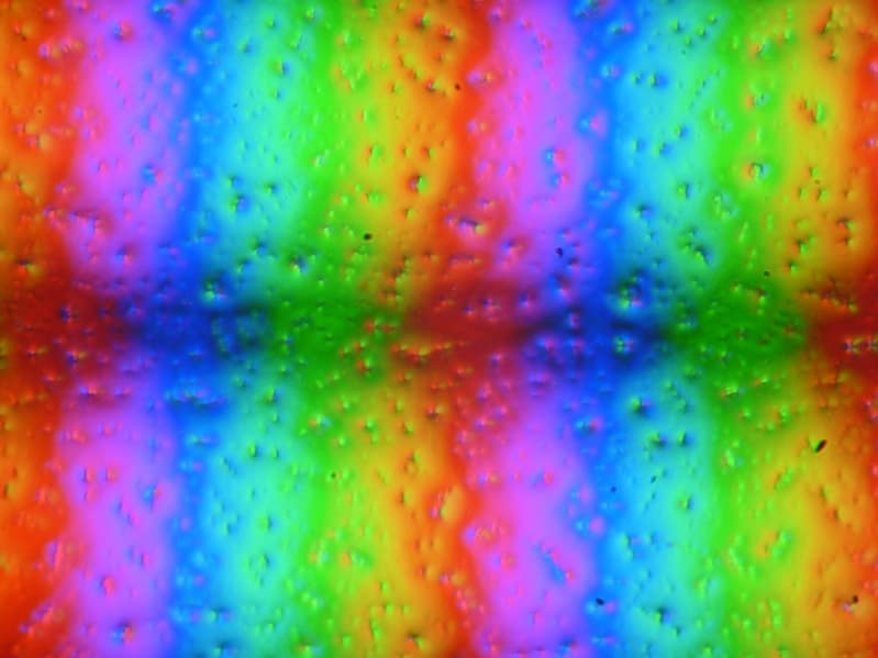Зерно этих дефектов в несколько раз меньше размеров субпикселей (масштаб этих двух фотографий одинаковый), поэтому фокусировка на микродефектах и «перескок» фокуса по субпикселям при изменении угла зрения выражены слабо, из-за этого нет и «кристаллического» эффекта.