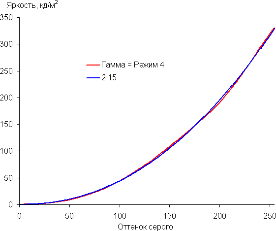 Аппроксимация (уже по 256 точкам) полученной гамма-кривой дала показатель 2,15, что немного ниже стандартного значения 2,2, при этом реальная гамма-кривая чуть-чуть отклоняется от аппроксимирующей степенной функции: