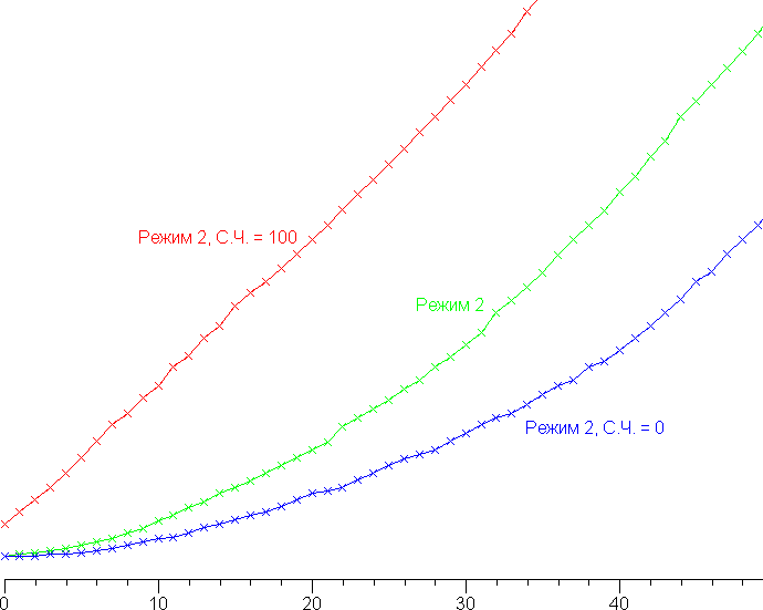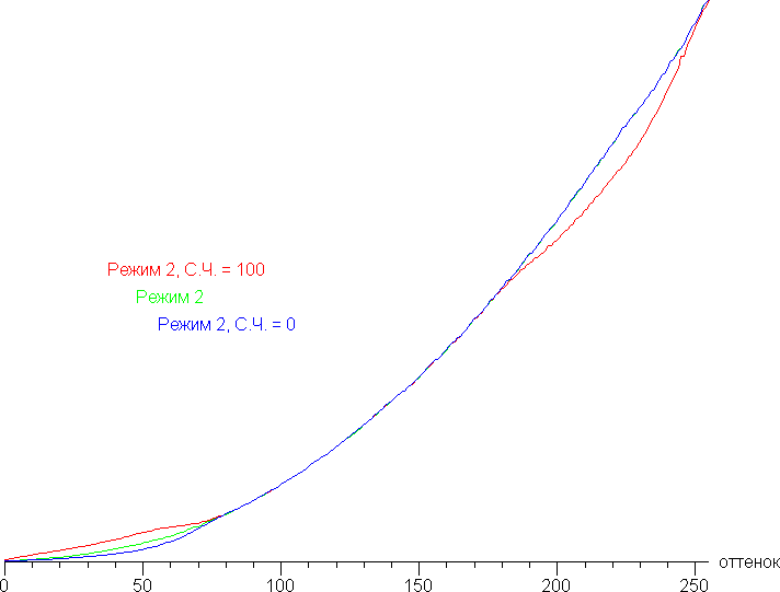 Реальная гамма-кривая зависит от выбранного профиля (Режим 1 — 4) в списке Гамма (значения показателей аппроксимирующей функции приведены в скобках в подписях, там же — коэффициент детерминации R²):