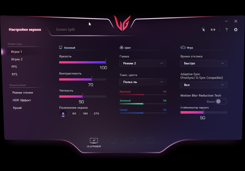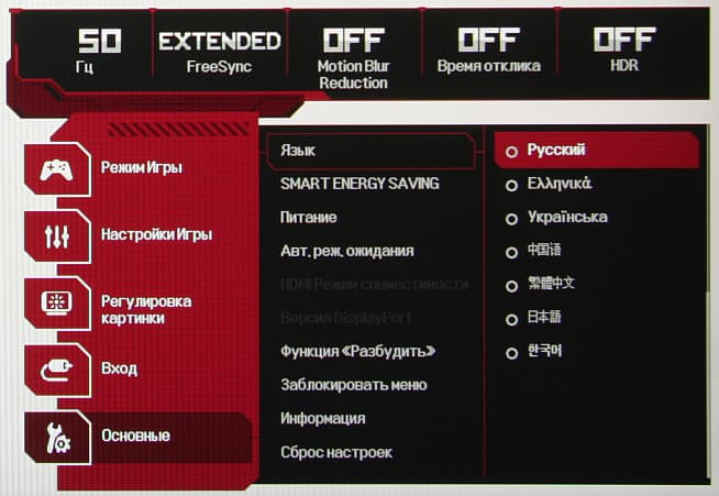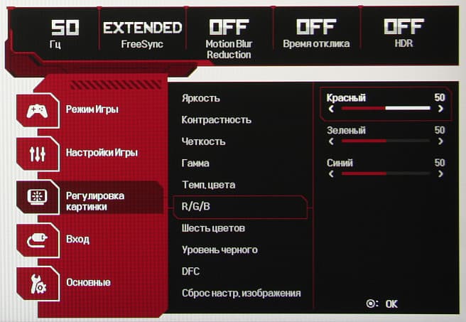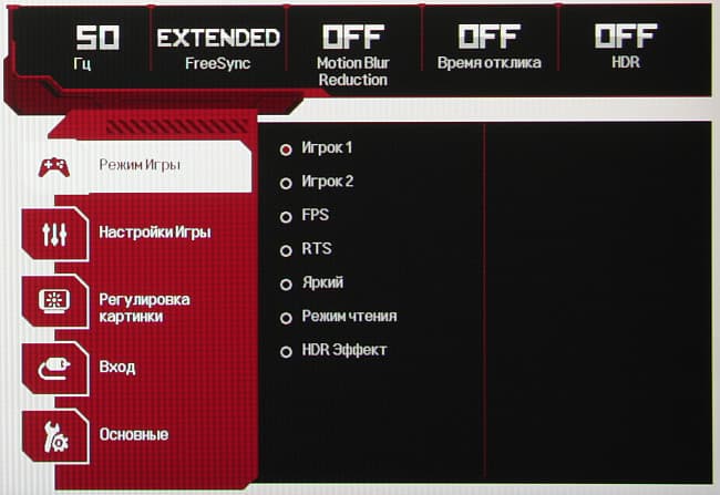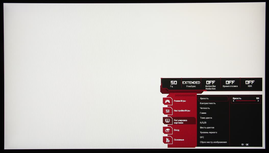 В дополнение к выбору профиля гамма-коррекции есть настройка, изменяющая различимость градаций в тенях, что может пригодиться в играх с темными сценами. Также можно регулировать разгон матрицы и включать/выключать режим вставки черного кадра и FreeSync. Присутствует набор предустановленных значений настроек в виде нескольких профилей.
