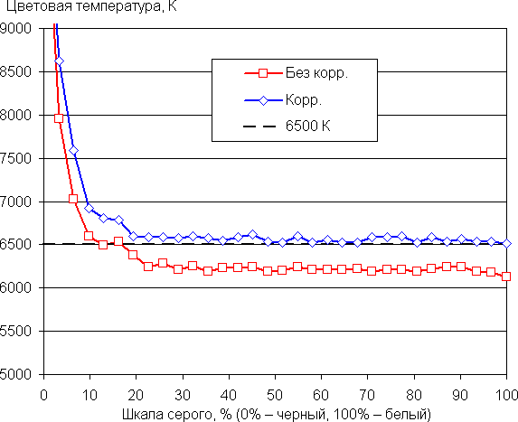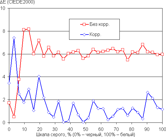 Самый близкий к черному диапазон можно не учитывать, так как в нем цветопередача не так важна, а погрешность измерения цветовых характеристик высокая. Ручная коррекция еще больше приблизила цветовую температуру к 6500 К и уменьшила значение ΔE. Впрочем, для бытового применения просто выбрать исходный вариант Польз-ль уже достаточно.