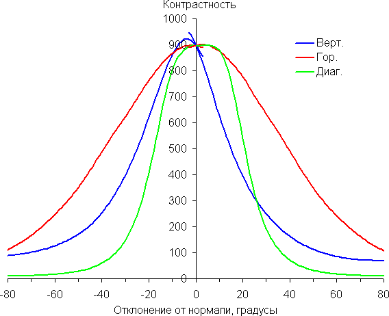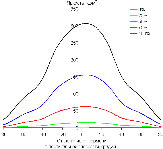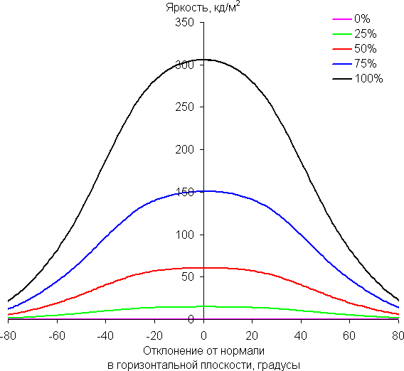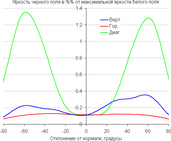 По скорости снижения яркости углы обзора довольно широкие, что для матрицы типа IPS, скорее, норма. При отклонении в диагональном направлении яркость черного поля начинает резко возрастать уже при 20°-30° отклонения от перпендикуляра к экрану. Если сидеть не очень далеко от экрана, то черное поле по углам будет заметно светлее, чем в центре (оставаясь практически нейтральным по оттенку). Контрастность в диапазоне углов ±82° только в случае отклонения по диагонали достигает значения 10:1 при 81°-82°, для двух других направлений контрастность существенно выше.
