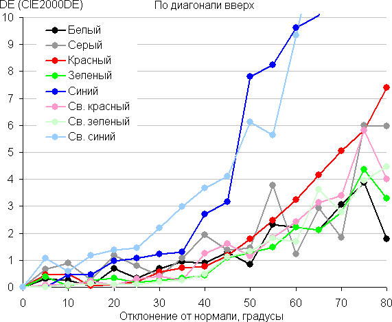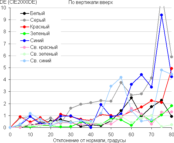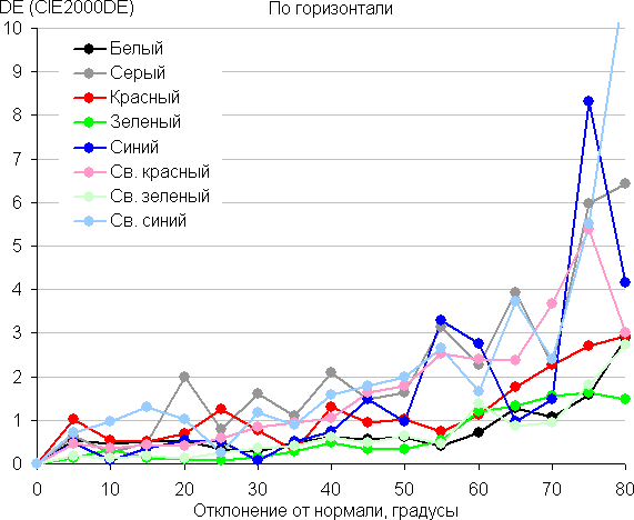 Для количественной характеристики изменения цветопередачи мы провели колориметрические измерения для белого, серого (127, 127, 127), красного, зеленого и синего, а также светло-красного, светло-зеленого и светло-синего полей во весь экран с использованием установки, подобной той, что применялась в предыдущем тесте. Измерения проводились в диапазоне углов от 0° (датчик направлен перпендикулярно к экрану) до 80° с шагом в 5°. Полученные значения интенсивностей были пересчитаны в ΔE относительно замера каждого поля при перпендикулярном положении датчика относительно экрана. Результаты представлены ниже: