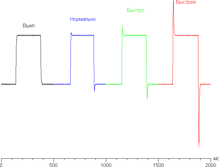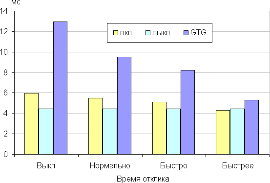 Время отклика зависит от значения одноименной настройки, которая управляет разгоном матрицы. График ниже показывает, как меняется время включения и выключения при переходе черный-белый-черный (столбики «вкл.» и «выкл.»), а также среднее суммарное (от первого оттенка до второго и обратно) время для переходов между полутонами (столбики «GTG»):