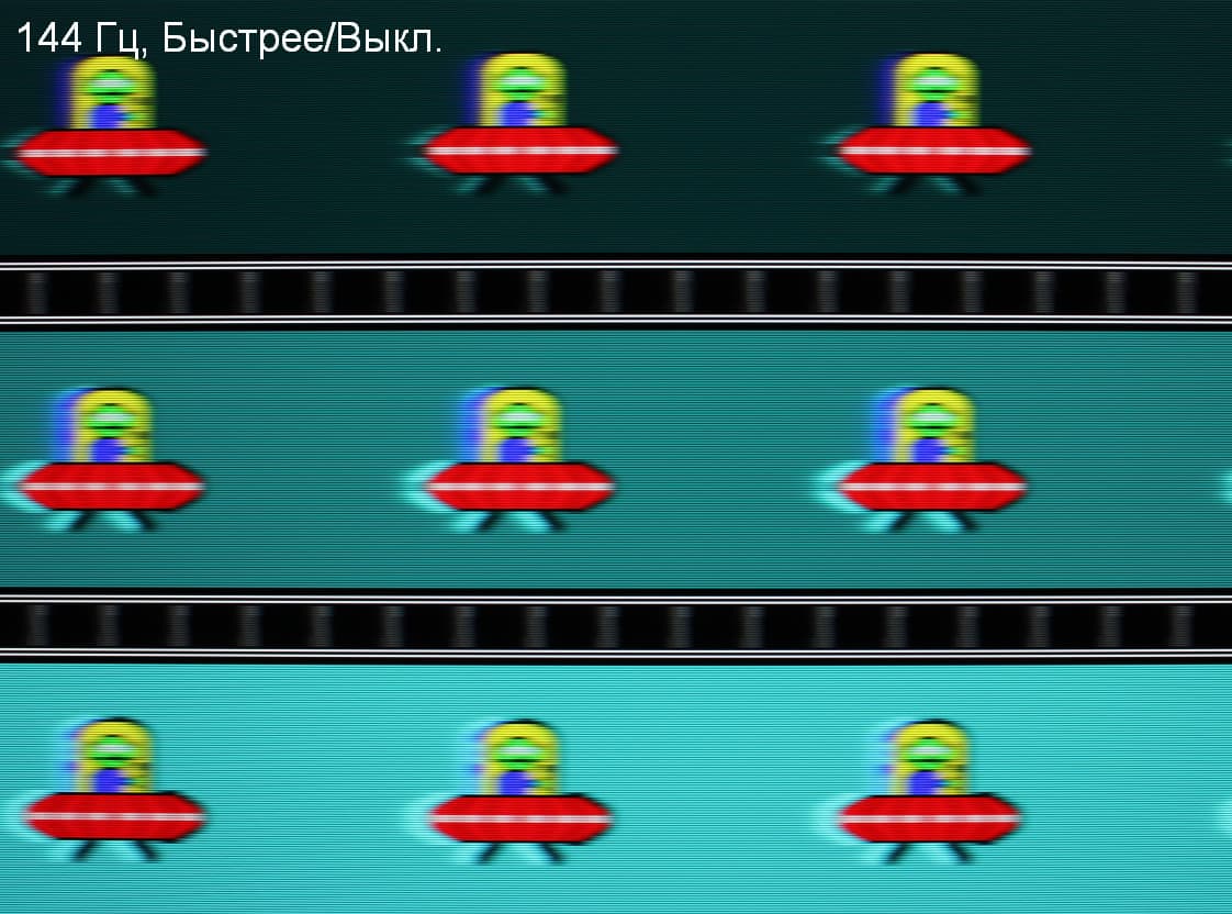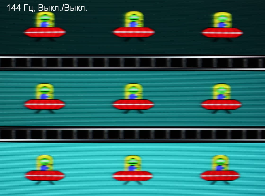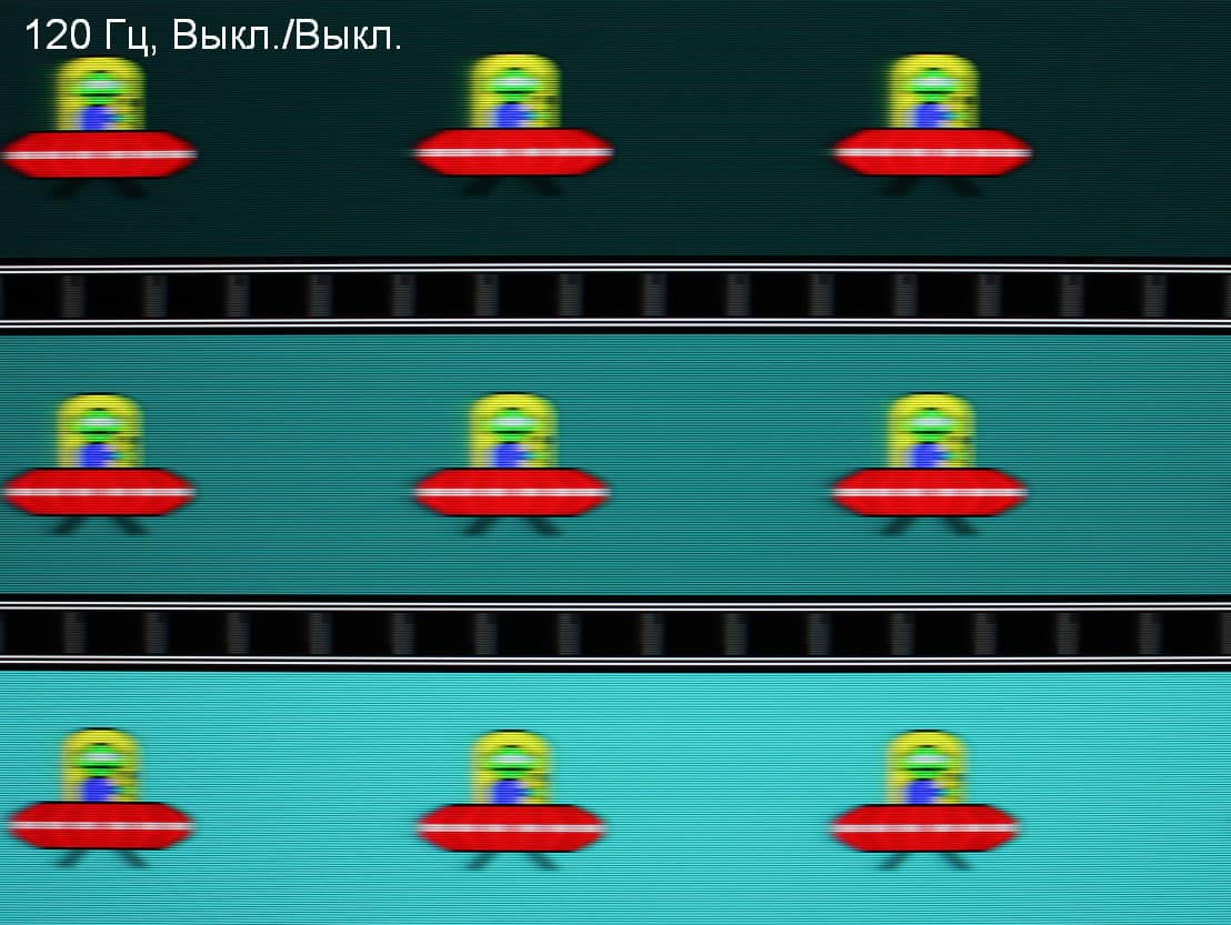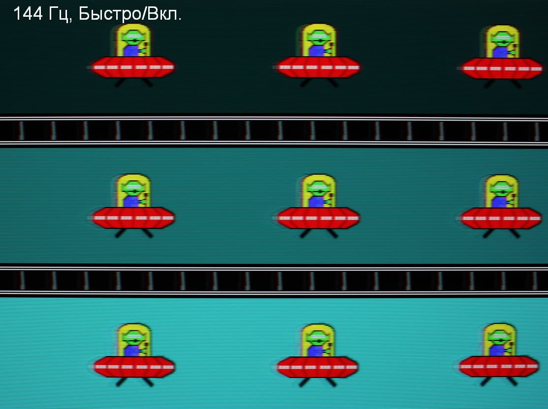 Видно, что при прочих равных условиях четкость изображения повышается по мере роста частоты обновления и степени разгона, но на максимальном разгоне артефакты уже очень заметные. Включение MBR увеличивает четкость, но объекты в движении двоятся, что снижает положительный эффект.