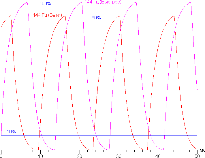 С нашей точки зрения, уже на предпоследнем уровне разгона скорости матрицы достаточно даже для самых динамичных игр. Приведем зависимость яркости (вертикальная ось) от времени (горизонтальная ось) при чередовании белого и черного кадра при 144 Гц кадровой частоты для варианта без разгона и с максимальным разгоном: