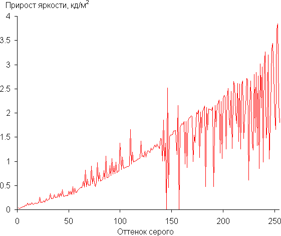 Реальная гамма-кривая ближе всего к стандартной при выборе Режим 2, поэтому далее мы измерили яркость 256 оттенков серого (от 0, 0, 0 до 255, 255, 255) при этом значении. График ниже показывает прирост (не абсолютное значение!) яркости между соседними полутонами: