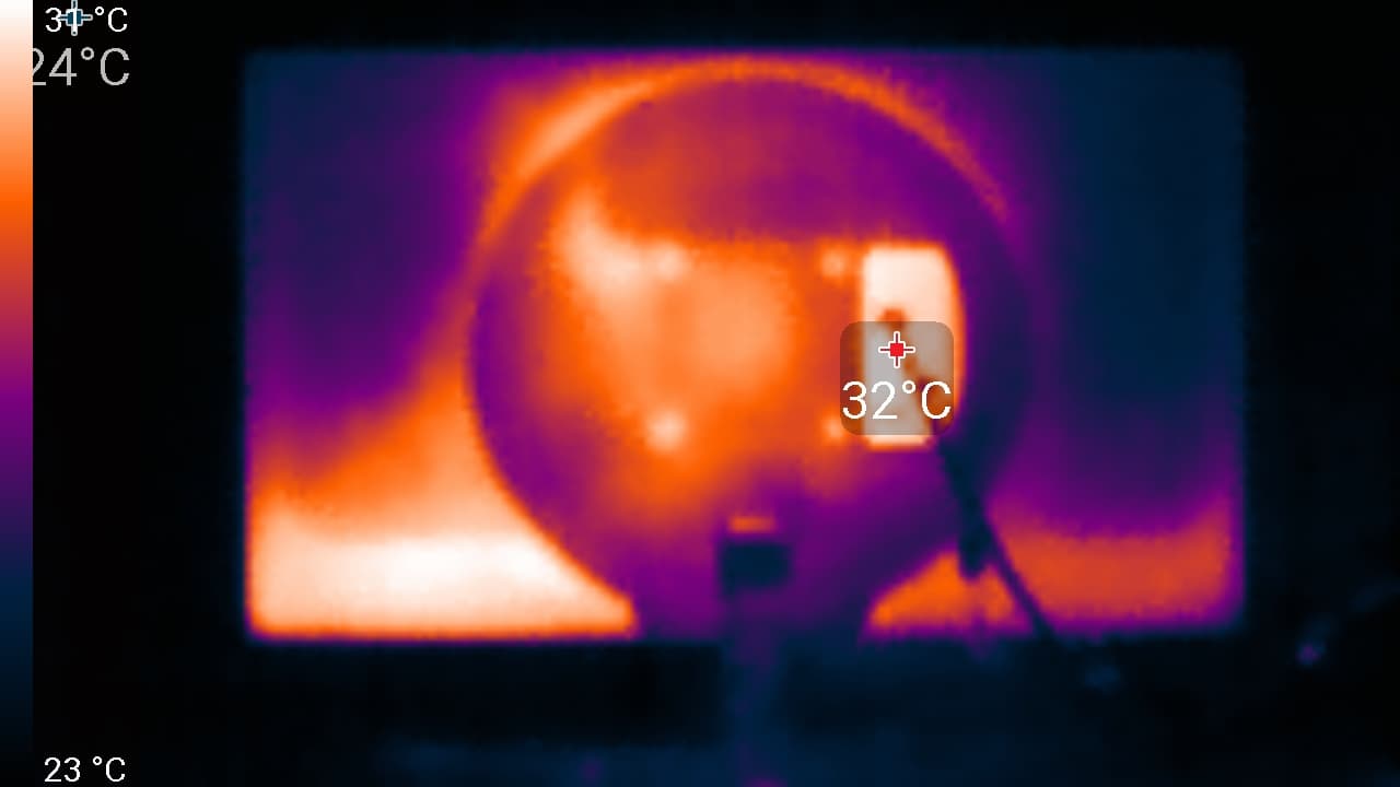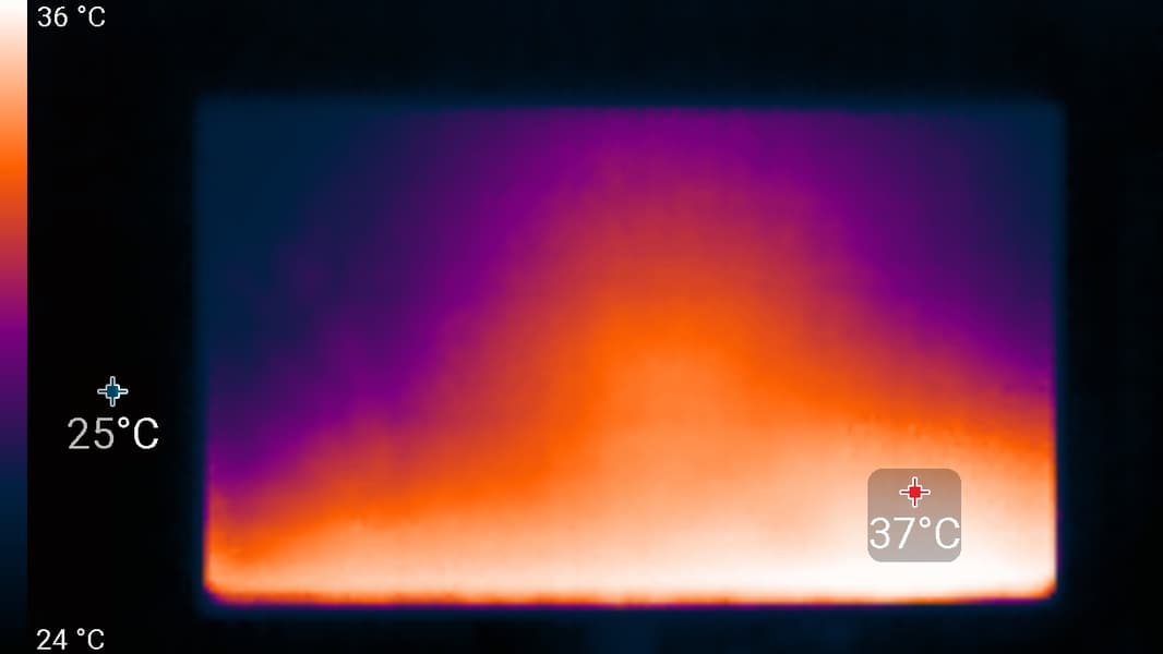 Нижний край экрана нагрелся до 37 °C максимум. Видимо, внизу находится светодиодная линейка подсветки экрана. Нагрев сзади умеренный: