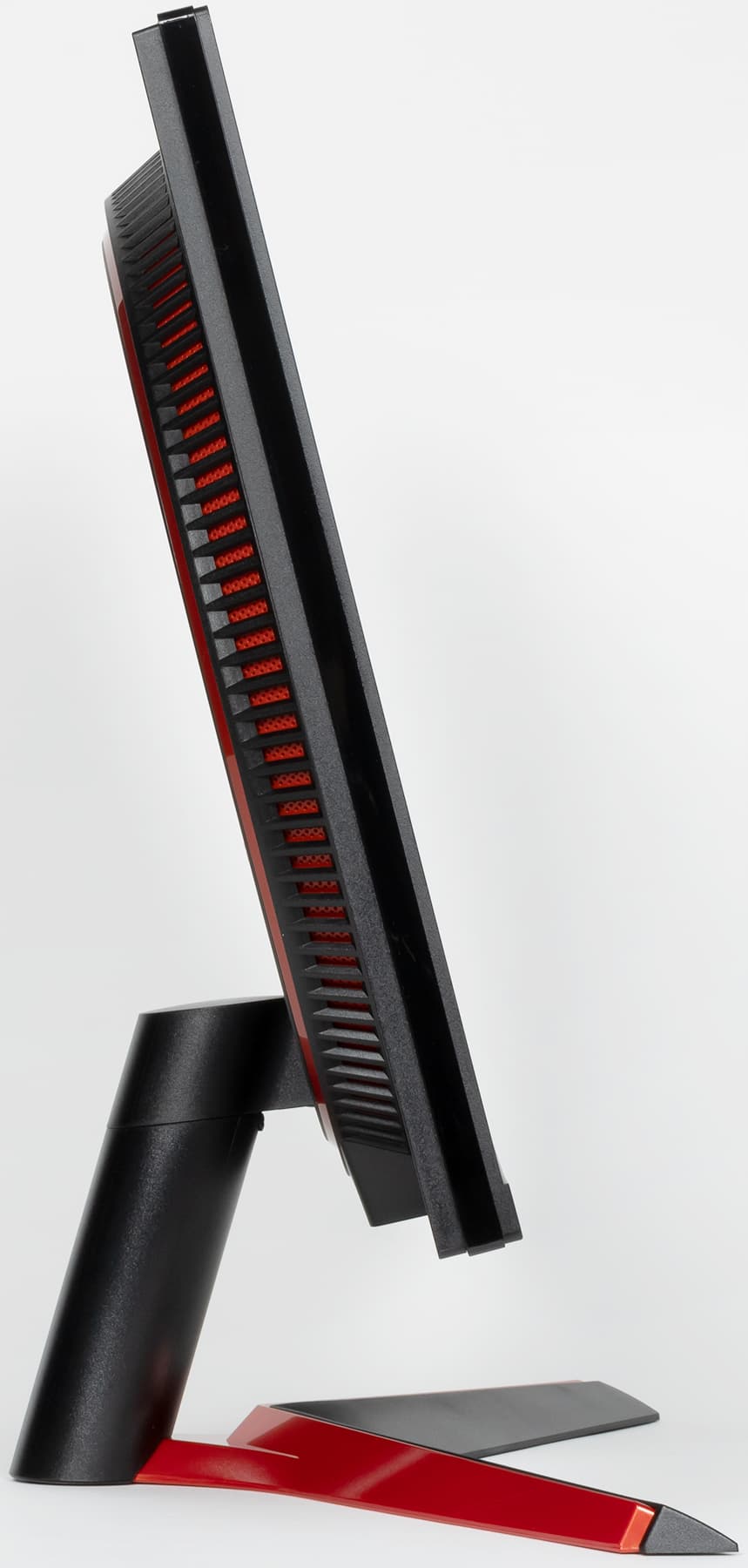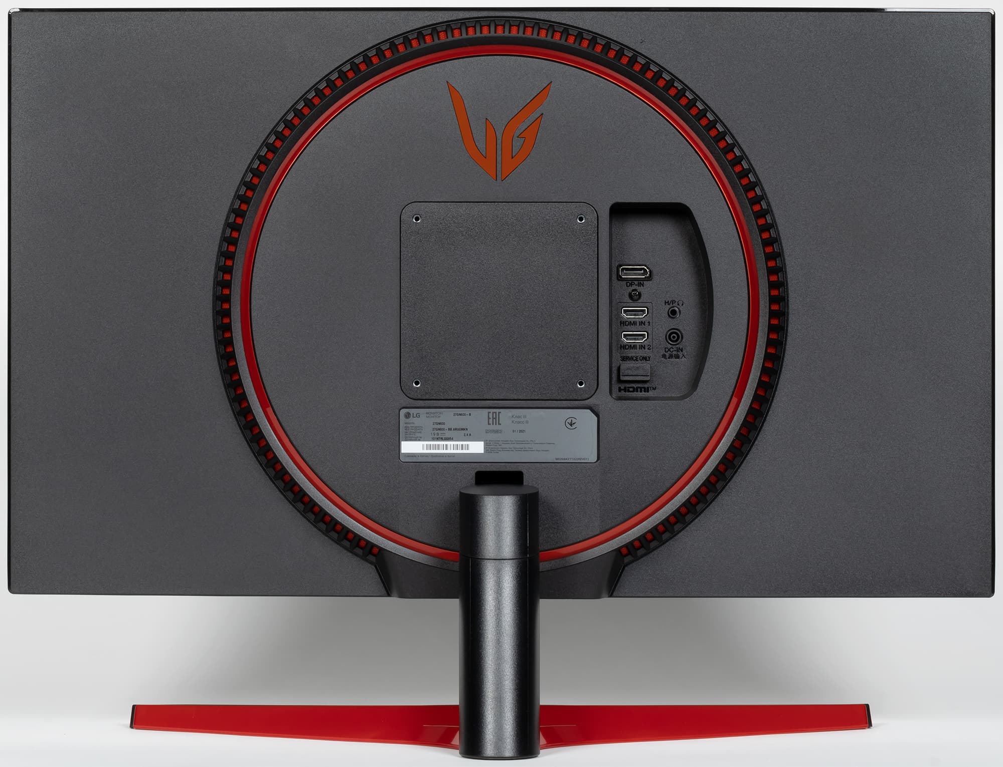 Панели корпуса блока экрана, а также кожухи подставки изготовлены в основном из черного пластика с матовой поверхностью. Но встречаются и глянцевые участки, а также вставки из пластика с красной поверхностью. Внешняя поверхность матрицы черная, полуматовая, зеркальность выражена. Экран выглядит как монолитная поверхность, ограниченная снизу пластиковой планкой, а сверху и с боков — узкой пластиковой окантовкой. Выведя изображение на экран, можно увидеть, что на самом деле между внешними границами экрана и собственно областью отображения есть неширокие поля (по 8 мм сверху и с боков и 20 мм снизу).