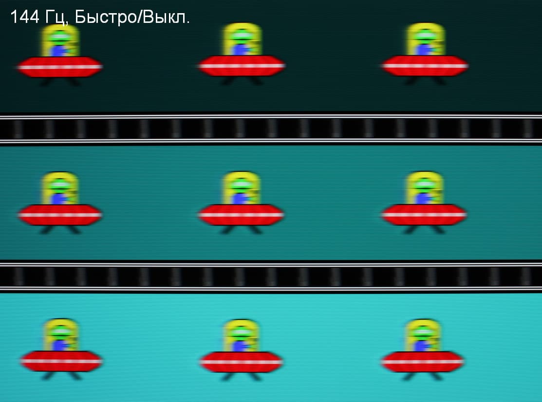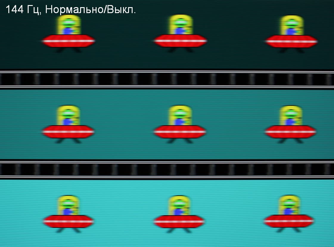 Попробуем представить, что было бы в случае матрицы с мгновенным переключением пикселей. Для нее при 60 Гц объект со скоростью движения 960 пиксель/с размывается на 16 пикселей, при 120 Гц — на 8 пикселей, при 144 Гц — на 6,6(6) пикселя. Размывается, так как фокус зрения движется с указанной скоростью, а объект неподвижно выводится на 1/60, 1/120 или на 1/144 секунды. Для иллюстрации этого сымитируем размытие на 16, 8 и 6,6(6) пикселя: