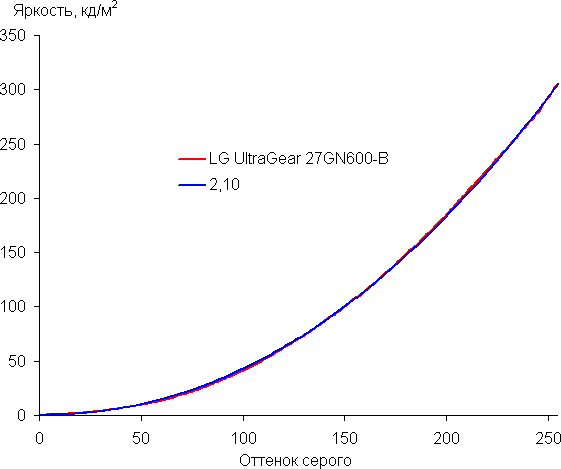 Аппроксимация полученной гамма-кривой дала показатель 2,10, что немного ниже стандартного значения 2,2, при этом реальная гамма-кривая мало отклоняется от аппроксимирующей степенной функции: