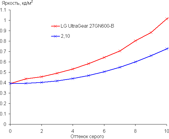 Рост прироста яркости, особенно в светлой области неравномерный и пара оттенков по яркости от предыдущего не отличается. Впрочем, в самой темной области аппаратно и визуально оттенки различаются хорошо: