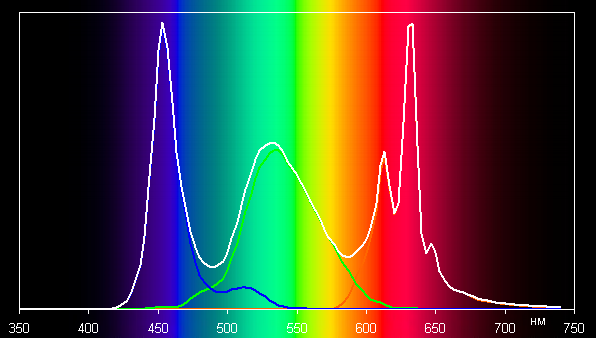 Впрочем, отклонения координат первичных цветов от вершин sRGB незначительные, поэтому визуально цвета на этом мониторе имеют практически естественные насыщенность и оттенок. Ниже приведен спектр для белого поля (белая линия), наложенный на спектры красного, зеленого и синего полей (линии соответствующих цветов):