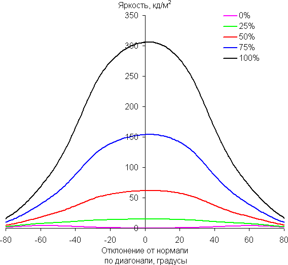 Чтобы выяснить, как меняется яркость экрана при отклонении от перпендикуляра к экрану, мы провели серию измерений яркости черного, белого и оттенков серого в центре экрана в широком диапазоне углов, отклоняя ось датчика в вертикальном, горизонтальном и диагональном направлениях.