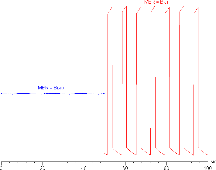 Есть режим со вставкой черного кадра (правда истинно черным он в данном случае не является) с названием Motion Blur Reduction (далее — MBR). Зависимости яркости (вертикальная ось) от времени (горизонтальная ось) для случаев, когда этот режим выключен и яркость подсветки максимальная и когда включен: