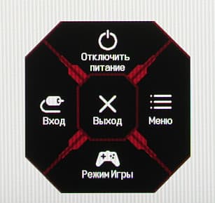Длительное нажатие, когда нет меню, выключает монитор. Короткое — включает. Из стартового меню можно выйти, перейти к выбору входа, к основному меню, в список выбора игрового режима (профиля изображения), или выключить монитор. Меню занимает на экране значительную площадь, что иногда мешает оценке вносимых изменений (для масштаба: белое поле — это вся область отображения):