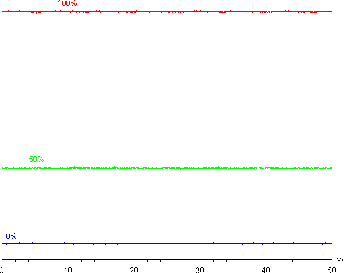 Яркость монитора меняется именно яркостью подсветки, то есть без ущерба для качества изображения (сохраняется контрастность и количество различимых градаций) яркость монитора можно менять в широких пределах, что позволяет с комфортом работать, играть и смотреть фильмы как в освещенном, так и в темном помещении. На любом уровне яркости значимая модуляция подсветки отсутствует, что исключает видимое мерцание экрана. Для тех, кто привык распознавать знакомое сокращение, уточним: ШИМ отсутствует. В доказательство приведем графики зависимости яркости (вертикальная ось) от времени (горизонтальная ось) при различных значениях настройки яркости: