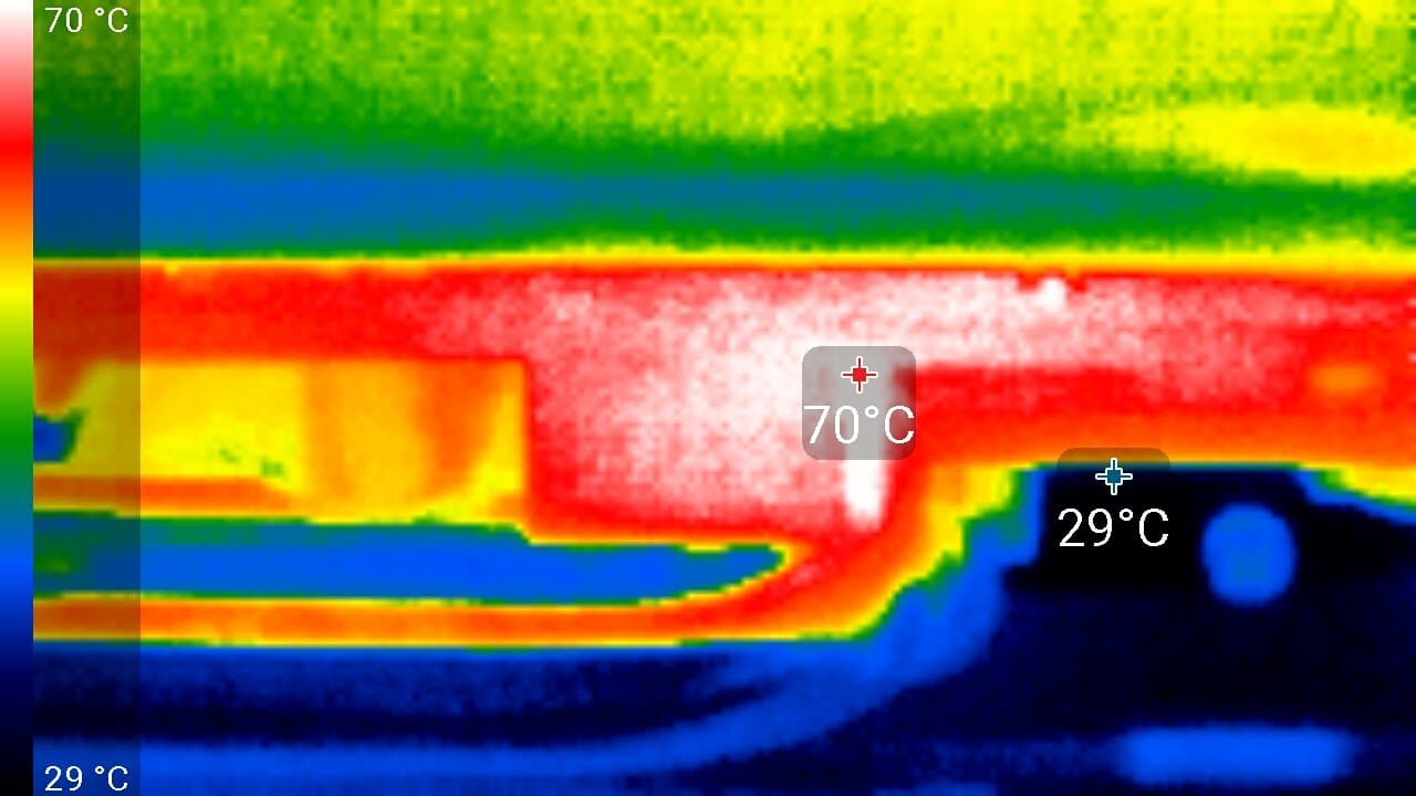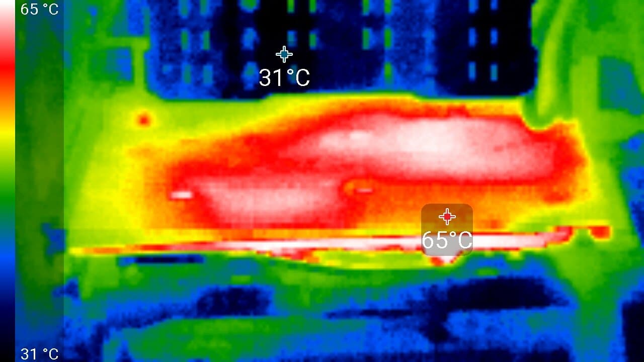 Максимальный нагрев — верхний край оборотной стороны PCB.