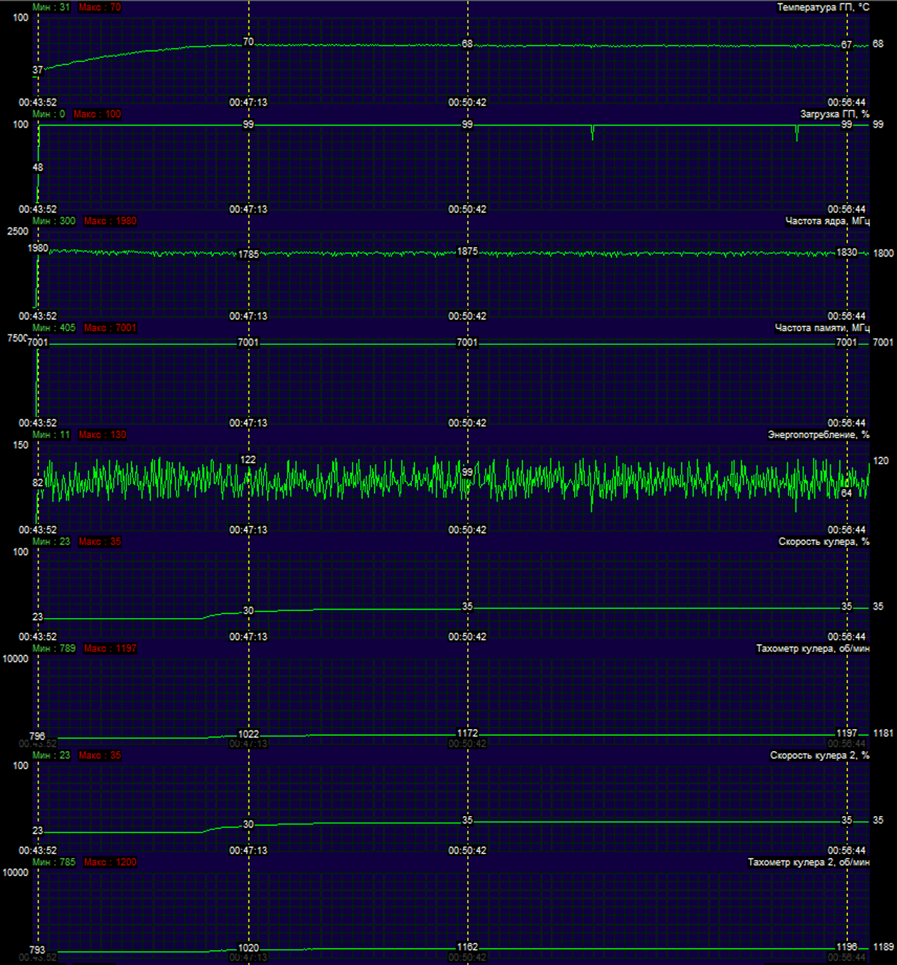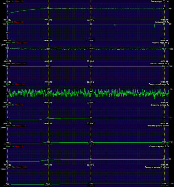 После 6-часового прогона под нагрузкой максимальная температура ядра не превысила 70 градусов, что является прекрасным результатом для видеокарты такого уровня.