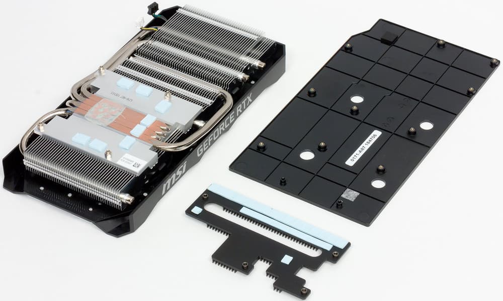 Учитывая, что карта изначально упрощена по сравнению с более «крутыми» версиями для оверклокеров и притязательных геймеров, частоты повышены крайне незначительно, поэтому и СО также упрощена, и перед нами уже не традиционный двухсекционный, а односекционный радиатор пластинчатого типа, хотя в нем все равно используются тепловые трубки. На подошве основного радиатора имеется и термоинтерфейс для охлаждения микросхем памяти. Для охлаждения силовых элементов конвертера питания имеется свой небольшой радиатор. На обороте карты установлена толстая пластина, служащая не только элементом жесткости и декора, но и охладителем PCB.