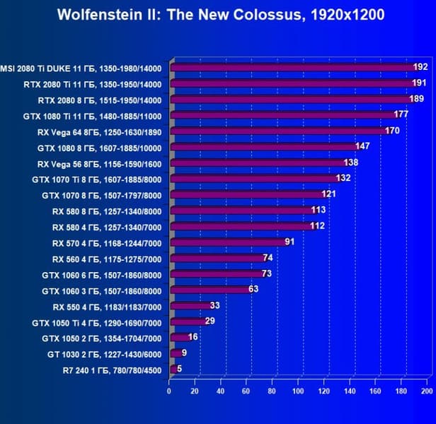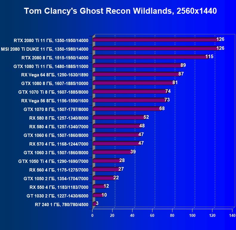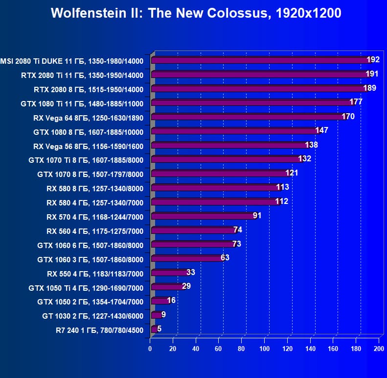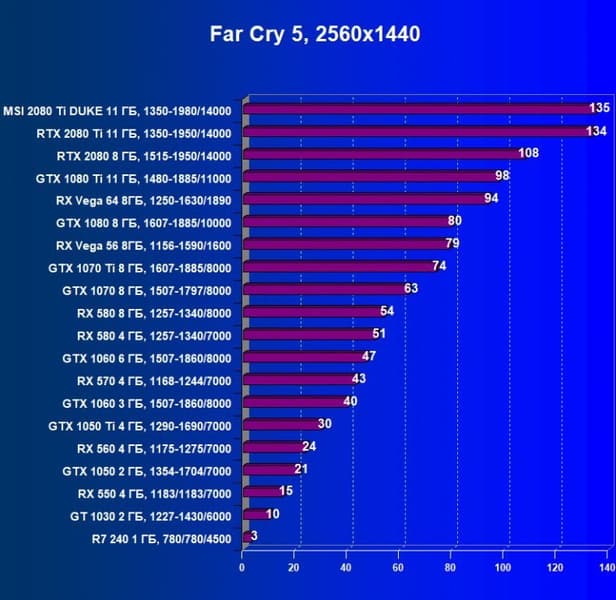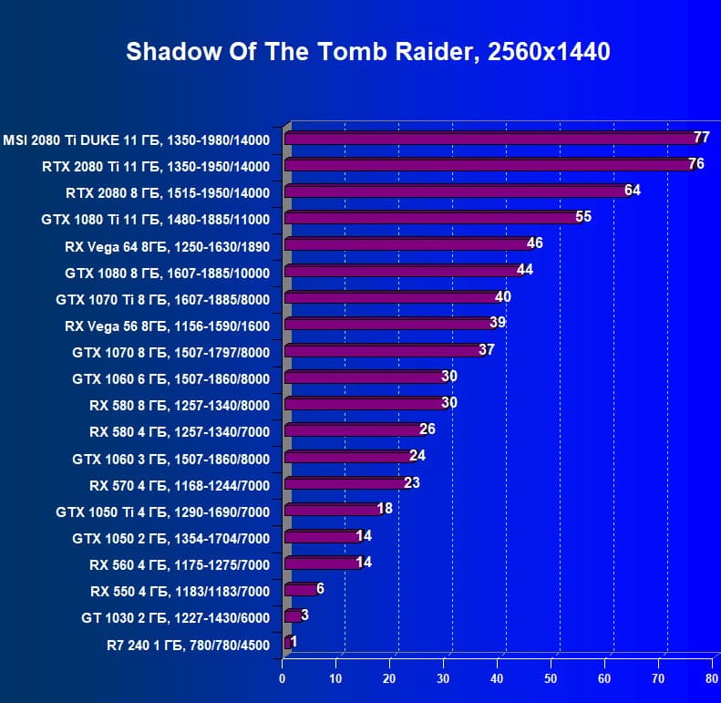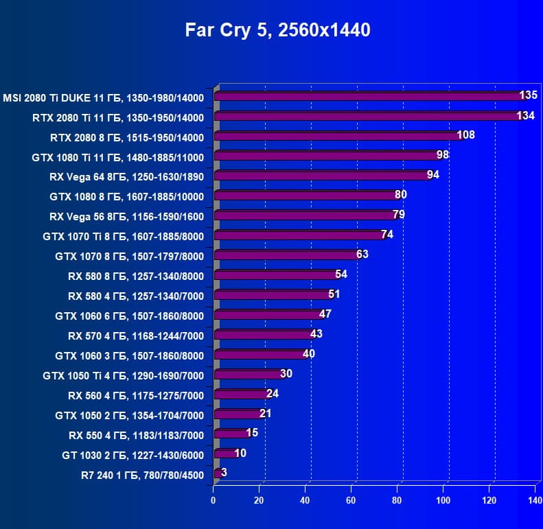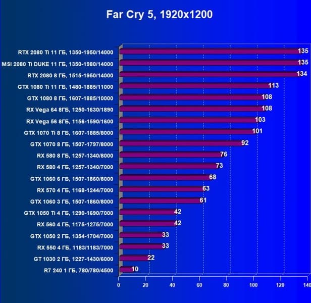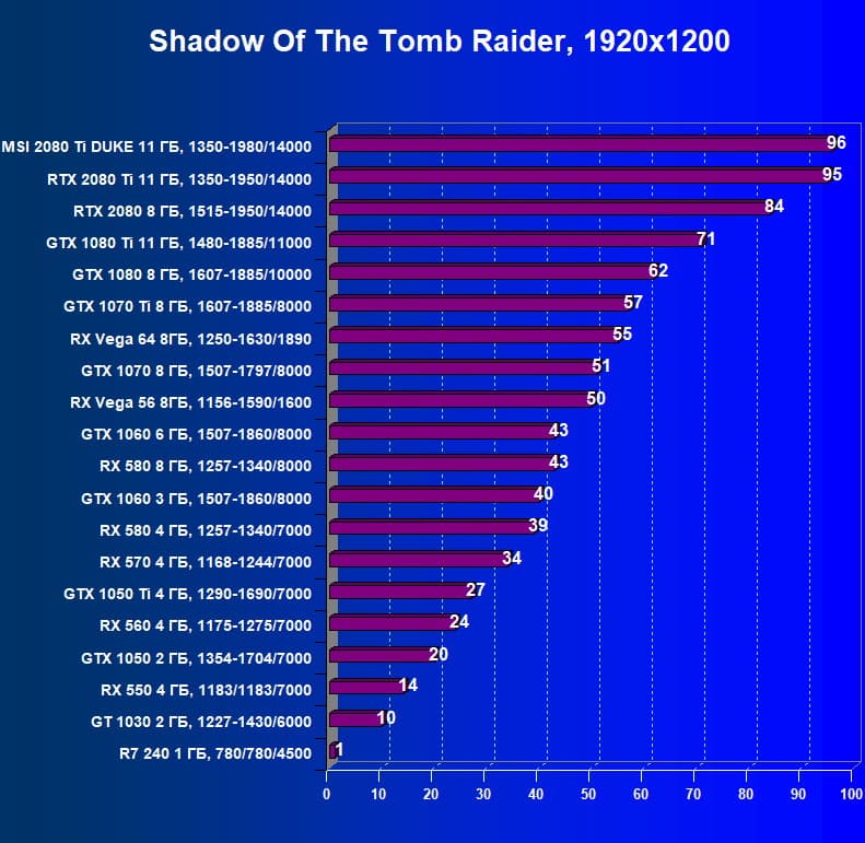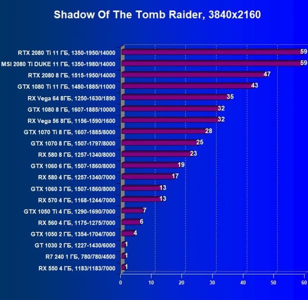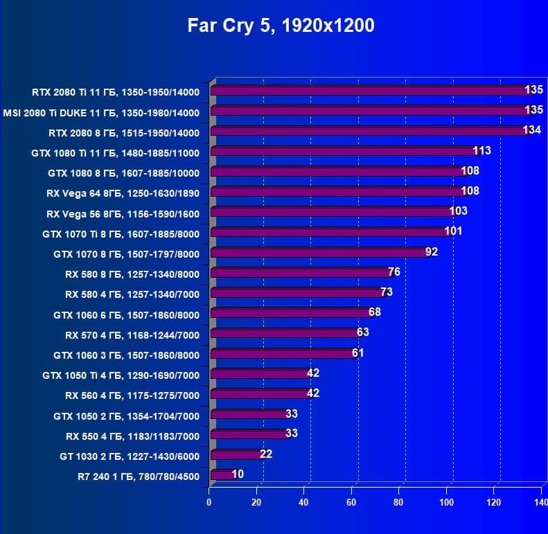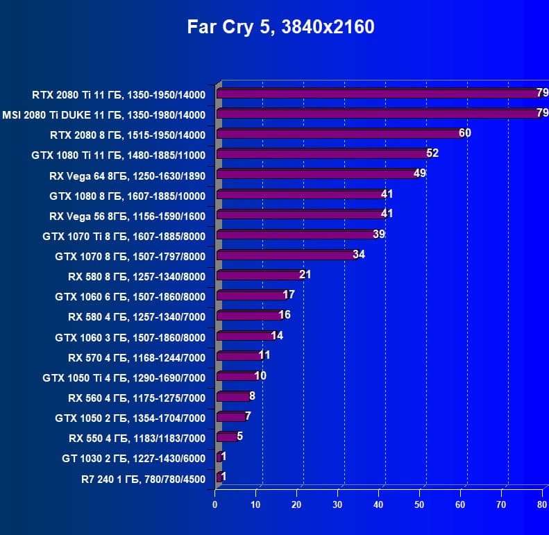 Частота работы ускорителя MSI повышена всего на 1,5% относительно варианта Nvidia Founder’s Edition, так что и разница в скорости между ними мизерная. Что касается конкурентов, то все они, очевидно, очень далеко, причем на втором месте даже не ускорители прошлых поколений, а RTX 2080.