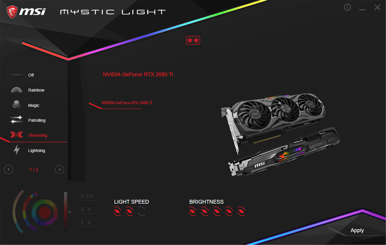 Главной частью кулера являются два массивных пластинчатых никелированных радиатора, соединенных между собой тепловыми трубками, впрессованными в основание, которые обеспечивают равномерное распределение тепла по ребрам радиатора. Поверх радиаторов установлен кожух с тремя вентиляторами, работающими на одинаковой частоте вращения. Вентиляторы серии Torx 2.0 имеют пониженный уровень шума, а также высоконадежны из-за особых подшипников. Кулер Zero Frozr останавливает вентиляторы в случае простоя или малой нагрузки (если температура GPU не выше 50-55 градусов), поэтому не стоит пугаться, если при запуске ПК вентиляторы на ускорителе не вращаются. Микросхемы памяти охлаждаются дополнительной пластиной, а силовые транзисторы охлаждаются основным радиатором. На обороте видеокарты установлена толстая пластина, которая обеспечивает жесткость относительно массивной видеокарты (предотвращая изгиб печатной платы), а также служит дополнительным радиатором для PCB (она прижата к печатной плате через термоинтерфейс). СО оснащена подсветкой, цветом которой можно управлять с помощью утилиты MSI Mystic Light.