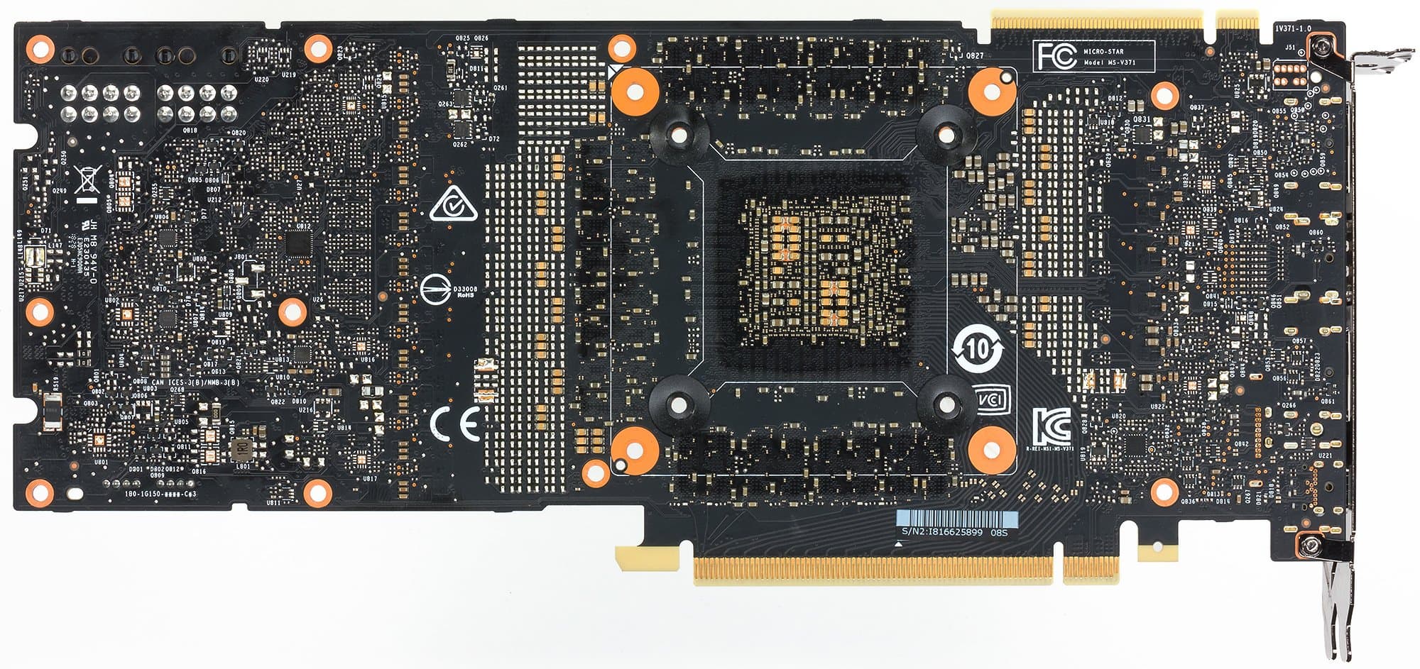 Очевидно, что печатная плата MSI полностью копирует референс-дизайн. На PCB разведена шина обмена в 384 бит (PCB рассчитаны на монтаж 12 микросхем памяти суммарным объемом в 12 ГБ, просто одна микросхема не установлена). Схема питания построена на базе 13-фазного цифрового преобразователя iMon DrMOS. Эта динамическая система управления питанием способна осуществлять мониторинг тока чаще раза в миллисекунду, что дает жесткий контроль над поступающим на ядро питанием и помогает GPU дольше работать на повышенных частотах. Система питания управляется контроллером uP9512P производства uPI.