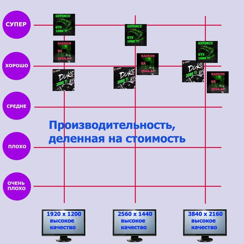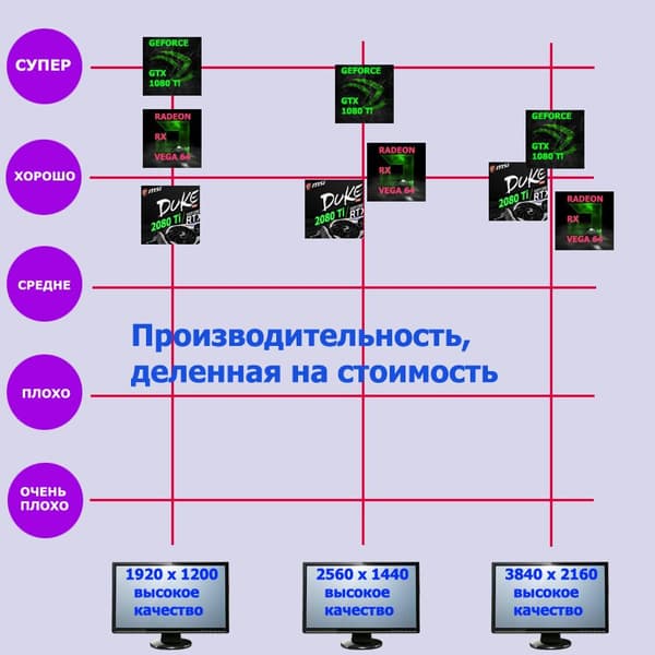 Да, пока стоимость RTX 2080 Ti чрезмерно высока, и даже в целевом разрешении 4К этот ускоритель проигрывает своим значительно более дешевым конкурентам. Однако тенденция видна хорошо: чем выше разрешение, тем выгоднее новый премиальный ускоритель. Несмотря на то, что Radeon RX Vega 64 почти в 2 раза дешевле, для разрешения 4К он годится плоховато, поэтому даже очень дорогой RTX 2080 Ti обгоняет его в данном рейтинге. Полагаем, что по мере снижения цен на RTX 2080 Ti (на момент написания материала этих карт на рынке все еще было слишком мало, поэтому цены на них практически не снижались) привлекательность этого ускорителя проявится не только по чистой производительности, но и с учетом ее соотношения с ценой.