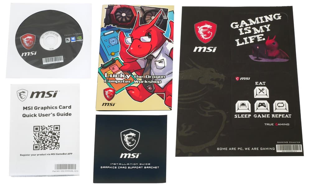 Базовый комплект поставки должен включать в себя руководство пользователя, диск с драйверами и утилитами (хотя, по идее, уже пора отказываться как от бумажек, так и от диска — все равно практически все пользователи скачивают ПО из интернета). Перед нами базовый комплект плюс очень полезная вещь: кронштейн для дополнительного крепления такой длинной и тяжелой видеокарты в корпусе системного блока. Ну, и бонусы: комикс с символом MSI, драконом, и пара фирменных подставок под стаканы.