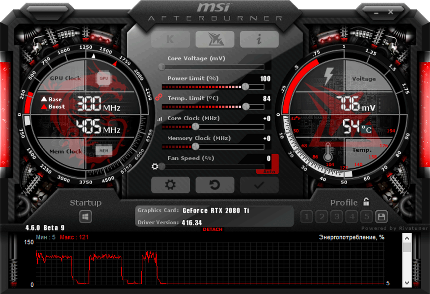 Управление работой карты обеспечивается с помощью фирменной утилиты MSI Afterburner (автор А. Николайчук AKA Unwinder), которую можно скачать с сайта производителя.