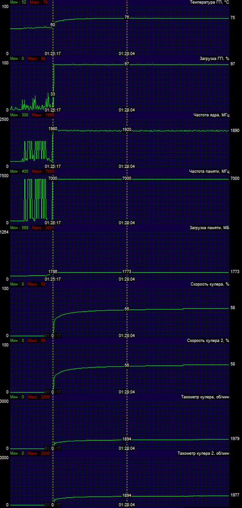 После 6-часового прогона под нагрузкой максимальная температура ядра не превысила 76 градусов, что является отличным результатом для видеокарты такого уровня.