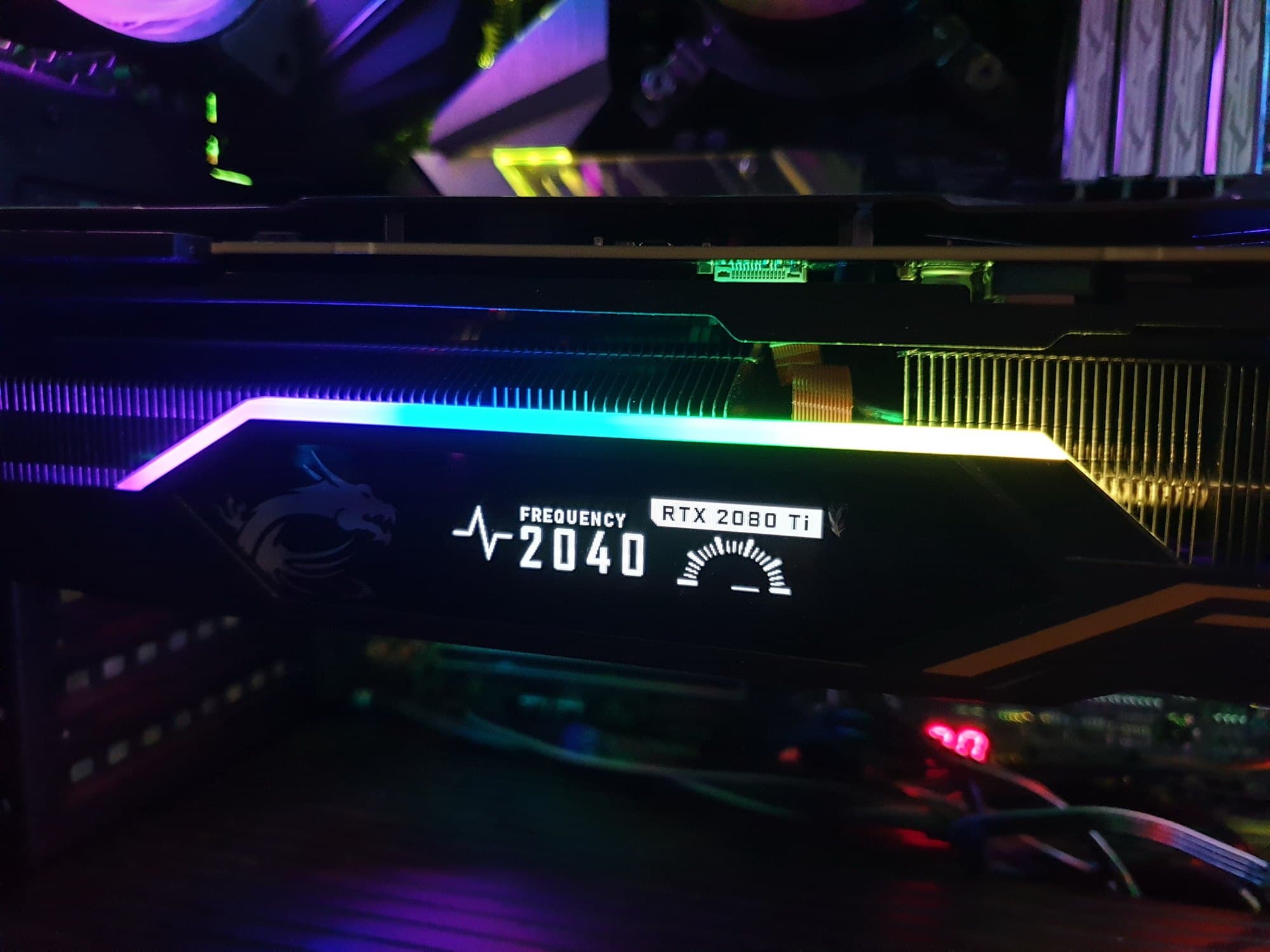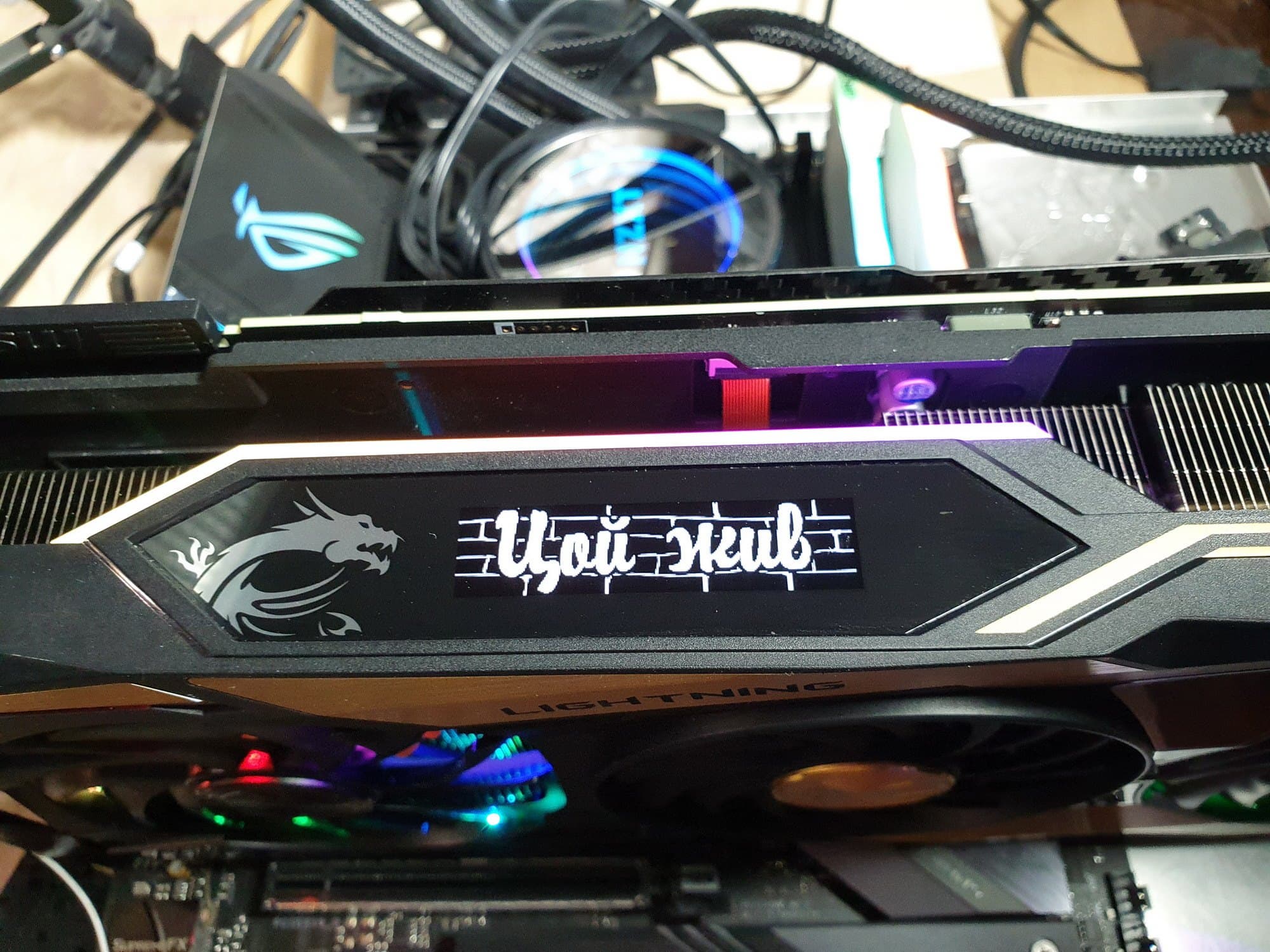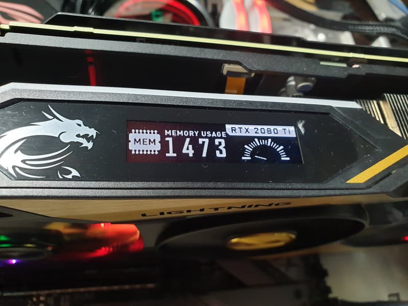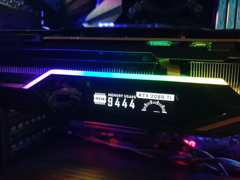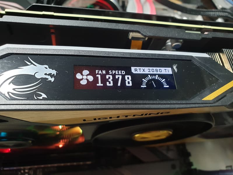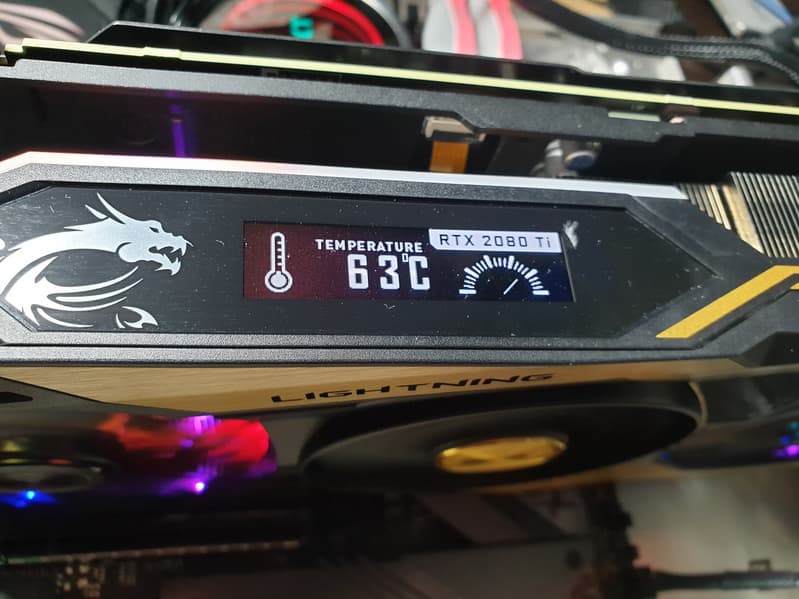 На верхнем торце СО имеется маленький дисплей, который управляется программно: на него можно вывести параметры работы карты, а также развлекательные микроанимации из стандартного набора MSI (включая фирменного дракона Лаки) и пользовательские GIF-анимации.