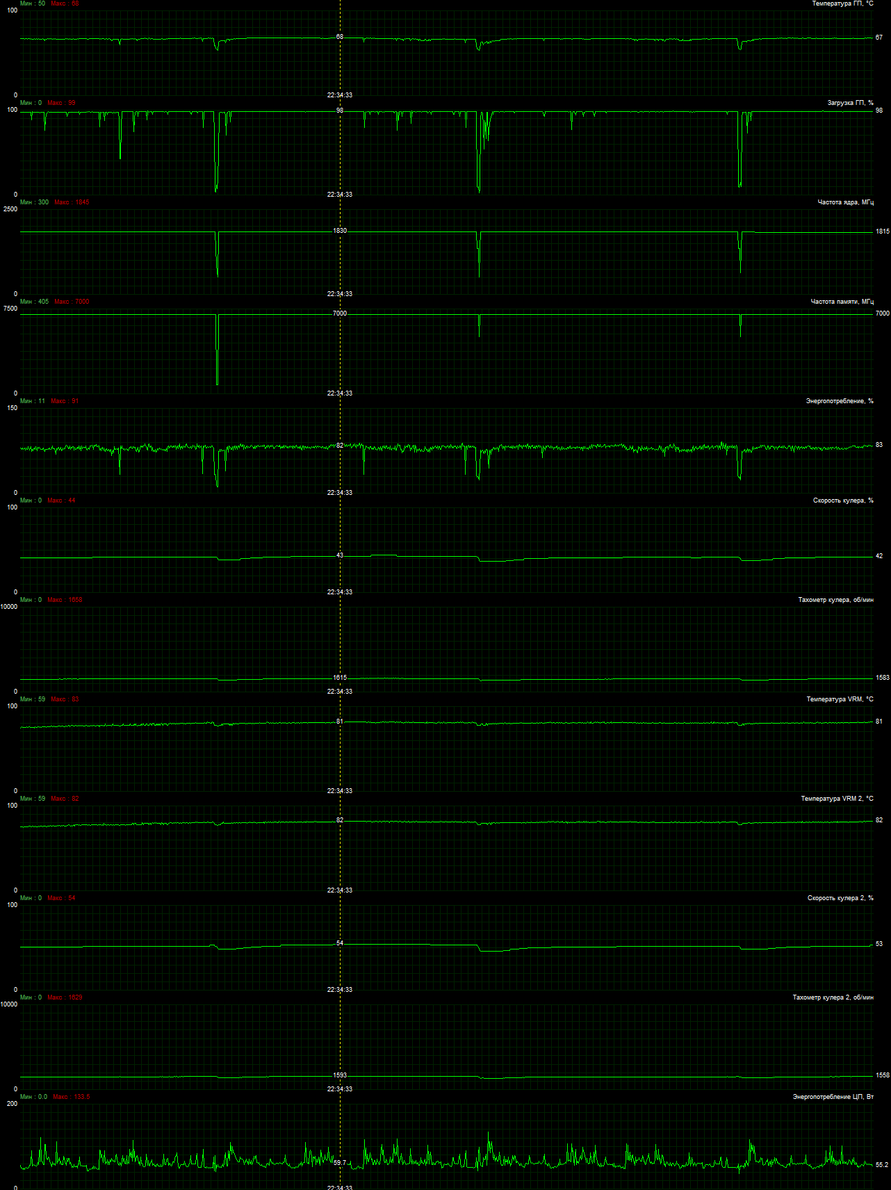 После 6-часового прогона под нагрузкой максимальная температура ядра не превысила 68 градусов, что является великолепным результатом для видеокарты такого уровня.