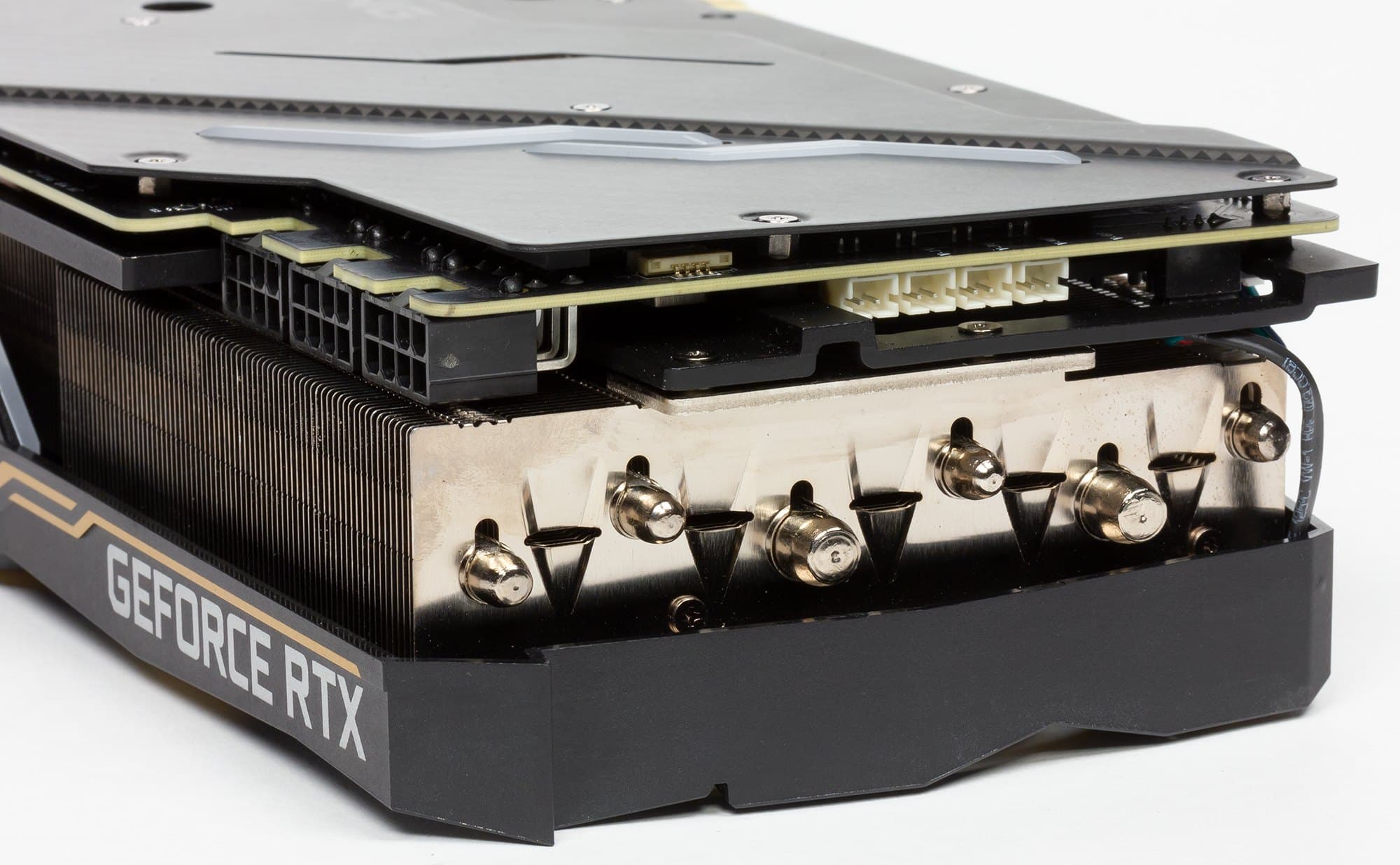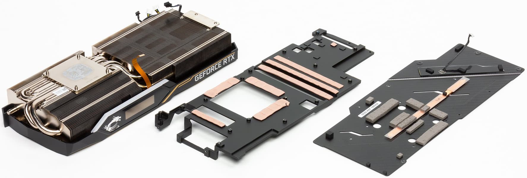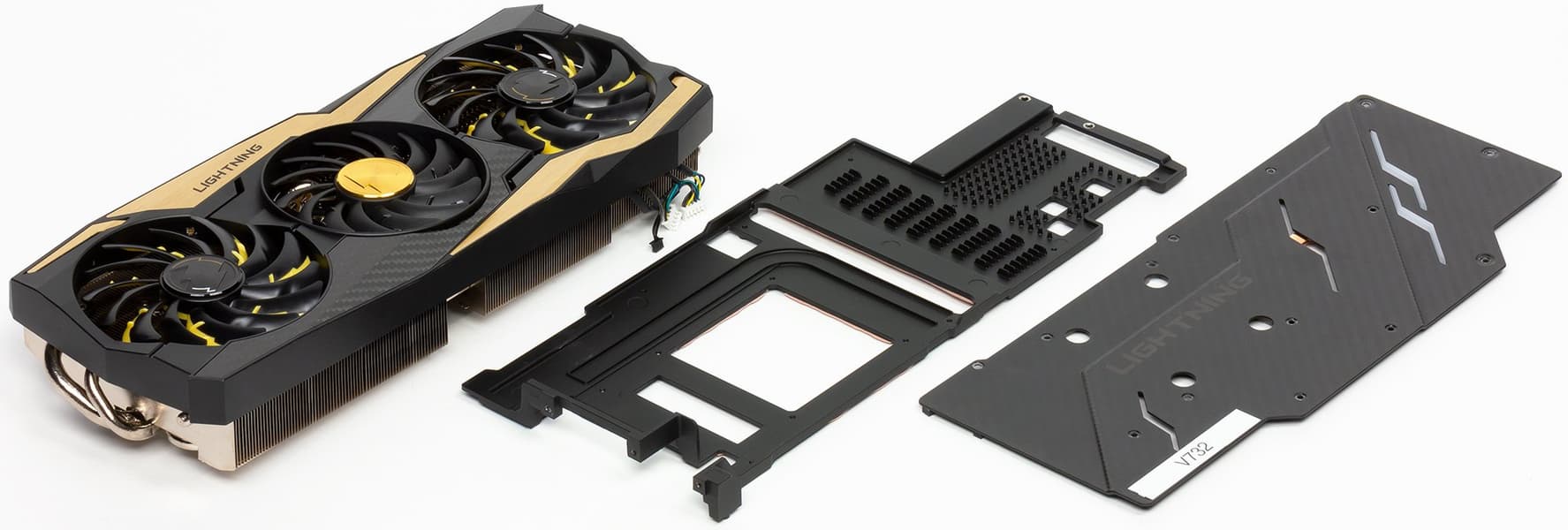 Понятно, что своими огромными габаритами карта обязана именно мощной системе охлаждения Tri-Frozr. Основой СО является огромный пластинчатый радиатор, состоящий из двух частей (секций). Секции соединяют тепловые трубки, проходящие через отполированное основание для прижима к GPU. Ребра радиатора имеют волнистый профиль, это улучшает качество охлаждения (по заявлению производителя). Для охлаждения микросхем памяти и силовых элементов системы питания предусмотрена отдельная массивная пластина.