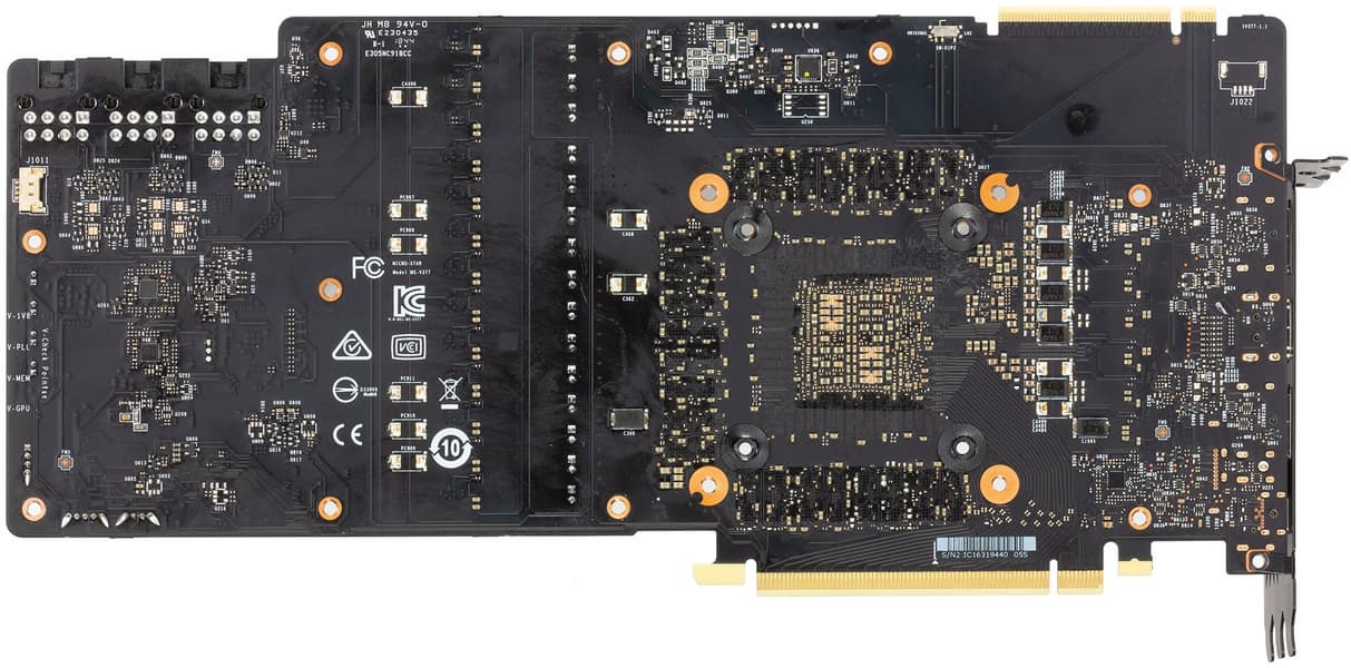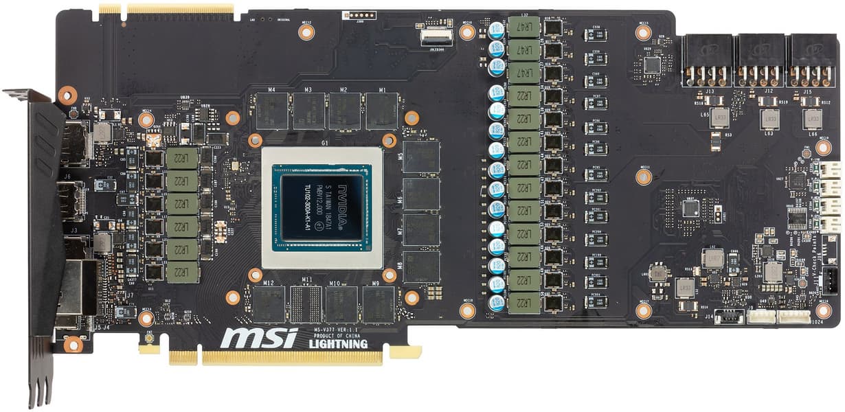 У всех видеокарт на базе GeForce RTX 2080 Ti печатная плата имеет разведенную шину обмена с памятью в 384 бит, то есть можно установить до 12 32-битных микросхем памяти суммарным объемом в 12 ГБ, просто одна микросхема не установлена, таким образом получен объем в 11 ГБ и шина обмена с памятью в 352 бит.