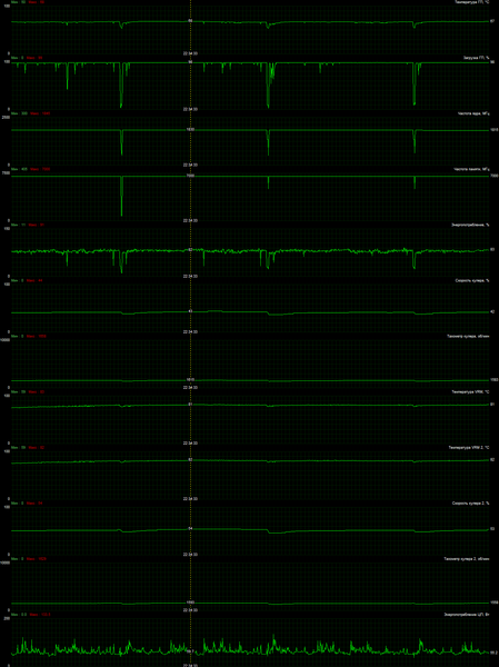 В режиме максимальной нагрузки в 3D температура достигала 68 °C. Вентиляторы при этом раскручивались до 1660 оборотов в минуту, шум вырастал до 28,0 дБА, так что данную СО можно считать довольно тихой.