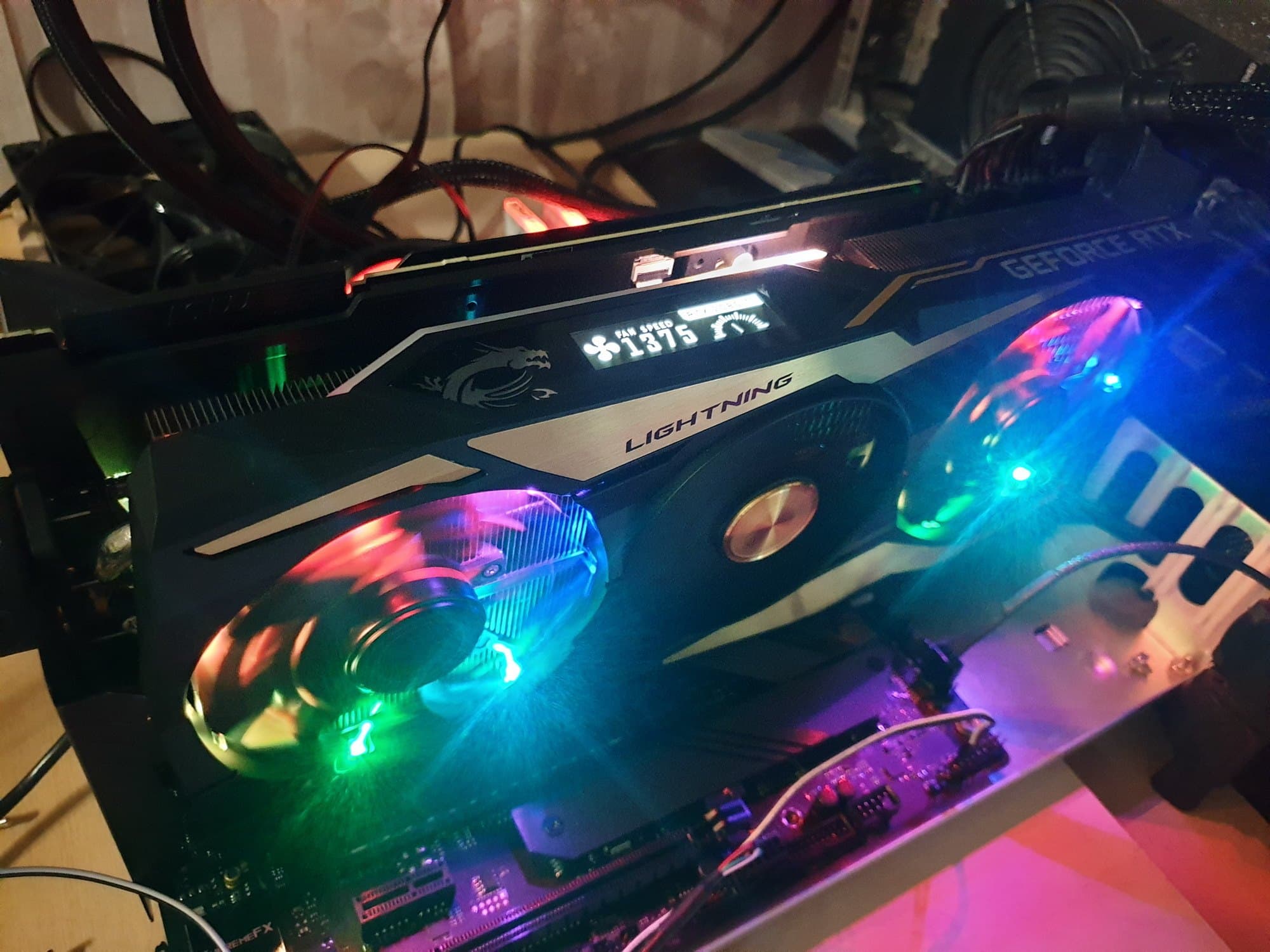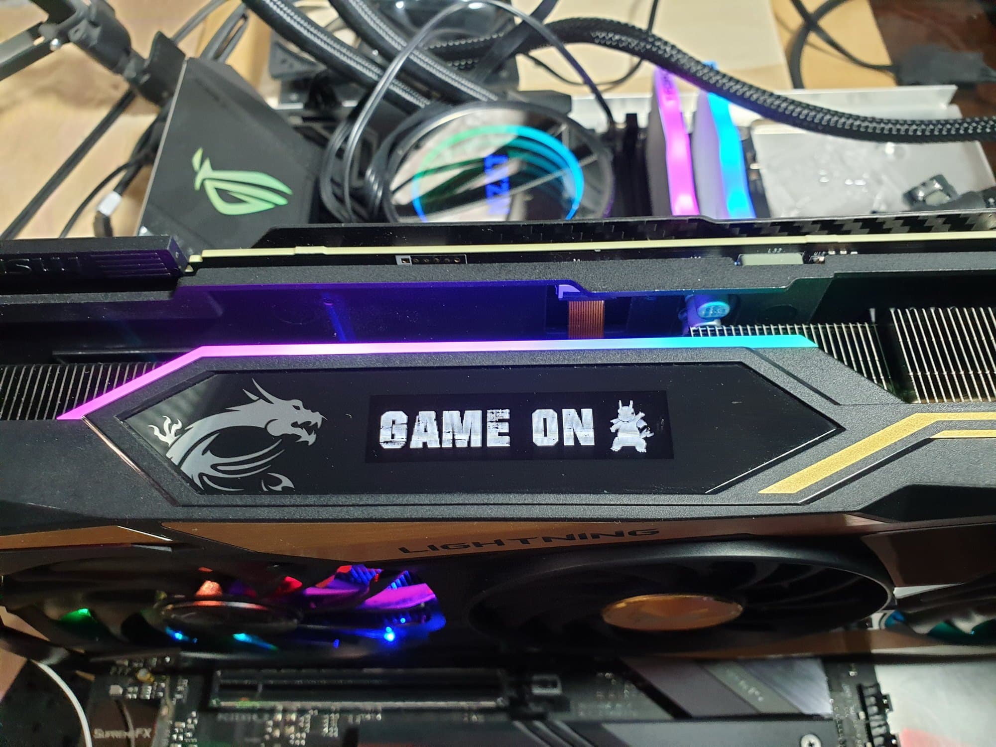 Играться с этой феерией огней можно долго. Желательно, конечно, установить карту в корпусе вертикально, но корпус для этого придется подбирать долго, ибо решений с возможностью монтажа райзера под установку видеокарты сбоку от материнской платы (чтобы видеть фронтальную часть видеокарты с максимально красивой подсветкой) вообще мало, а здесь еще и видеокарта «трехслотовая», тогда как обычно в корпусах под вертикально устанавливаемую карту выделяется пространство шириной в 2 слота. Впрочем, в таком случае будет видна прекрасная игра огней под вентиляторами, но, увы, станет почти не видно дисплей на торце. Если же все-таки устанавливать карту традиционно, горизонтально, то откроется шикарный вид на дисплей и его цветовую окантовку вместе с полосками на «бэкплейте».