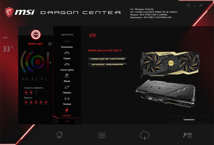 MSI GeForce RTX 2080 Ti Lightning Z (11 ГБ) представляет собой специфический элитный вариант самого быстрого на сегодня ускорителя. Это премиальное изделие демонстрирует высочайшую производительность даже в штатном режиме, ну а фанаты разгона могут запросить у MSI версию BIOS, снимающую лимиты Nvidia по напряжениям и TDP, и устремиться к установлению мировых рекордов. Разумеется, этот ускоритель станет прекрасным приобретением или подарком для любого хардкорного геймера, но для этого потребуется иметь кругленькую сумму денег или очень обеспеченных дарителей. Специалисты MSI (дизайнеры, инженеры и программисты) очень много вложили в создание такого красивого со всех сторон продукта.